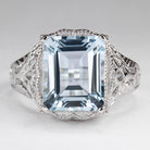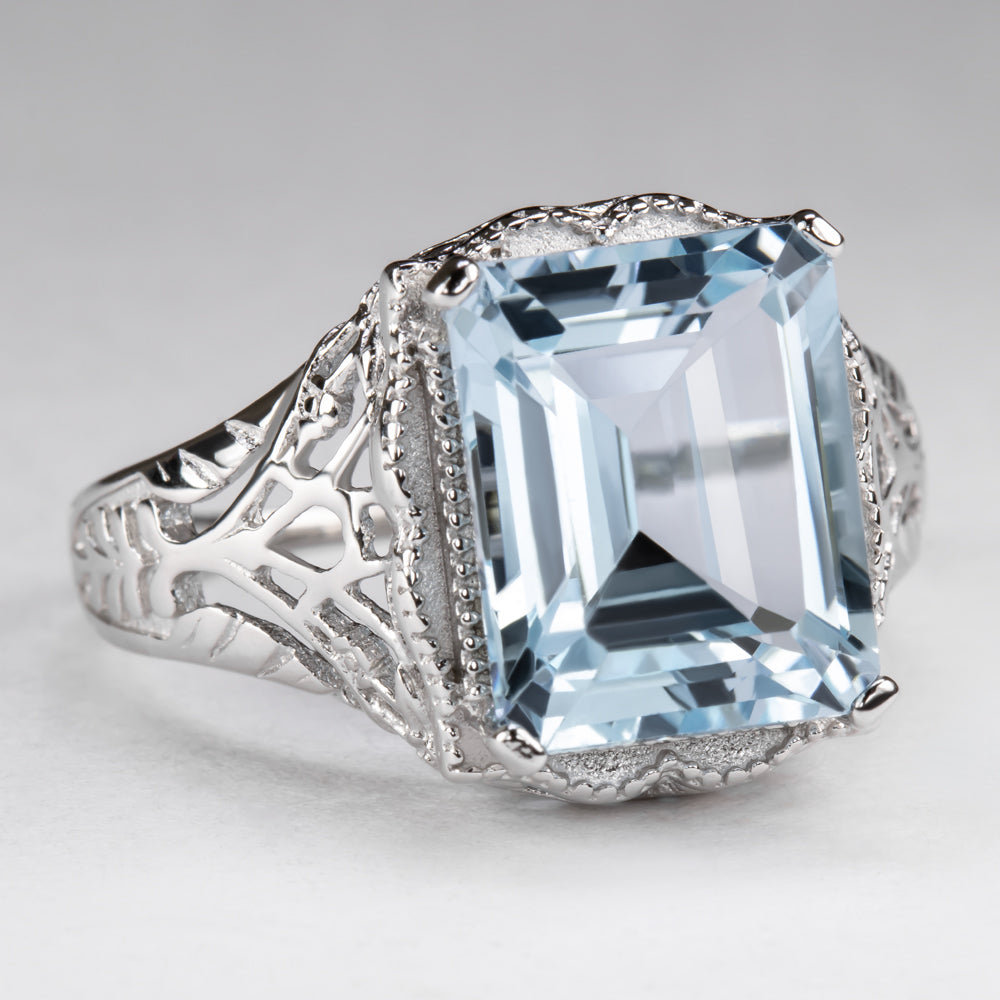 This vintage style ring features a sky blue topaz set in a sterling silver setting. The Art Deco style setting is beautifully crafted with ethereal filigree and botanical accents. The topaz is a natural, earth mined stone. The ring measures 14mm across (north south) and 7mm from finger to top.
