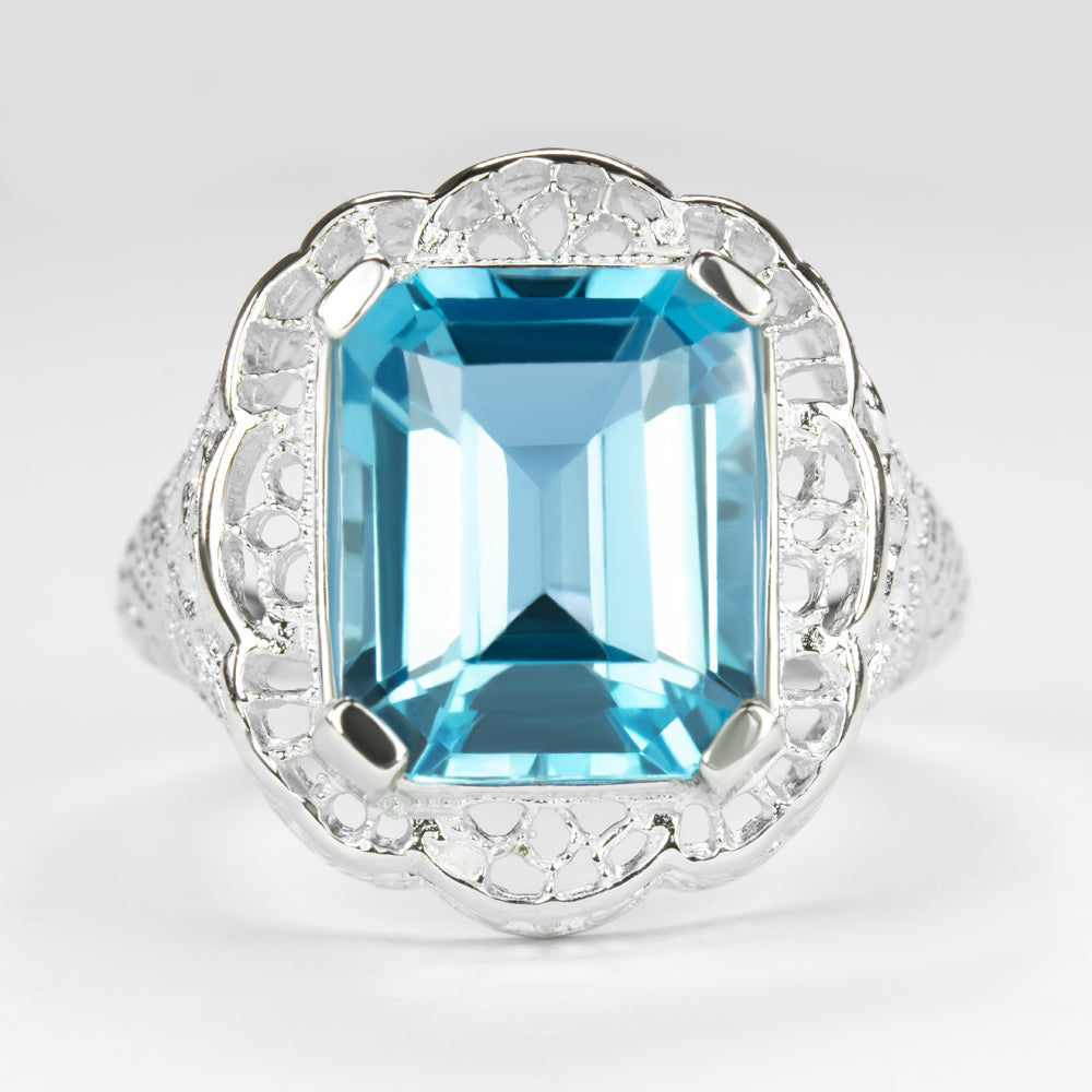 SWISS BLUE TOPAZ STERLING SILVER RING VINTAGE STYLE DECO FILIGREE EMERALD CUT