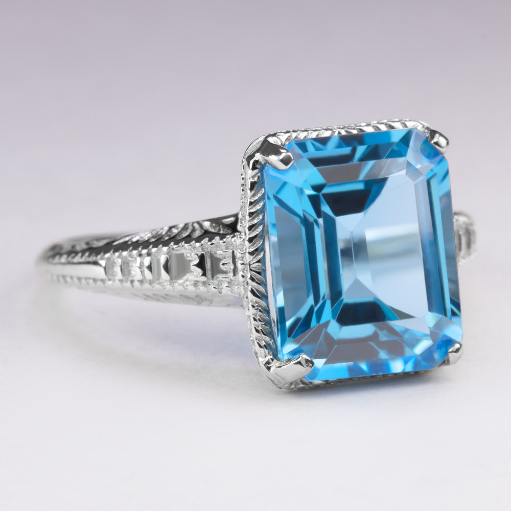 This vintage style ring features an emerald cut swiss blue topaz set in a sterling silver setting. The Art Deco style setting is beautifully crafted with romantic engraved details. The topaz is a natural, earth mined stone. The ring measures 12mm across (north south) and 6mm from finger to top.