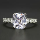 This elegant ring features a gorgeous light lilac gray spinel in a classic platinum setting with a diamond encrusted shank.