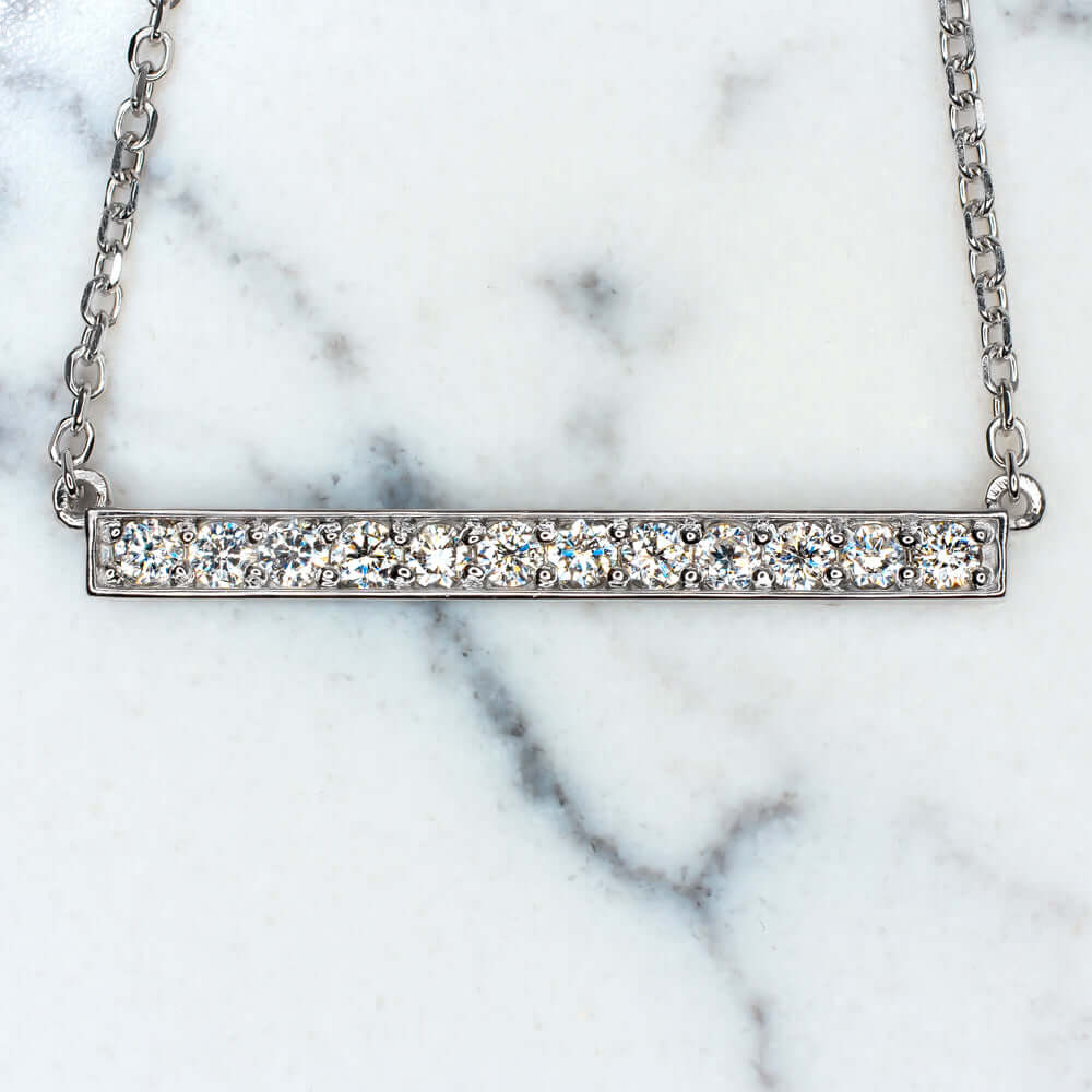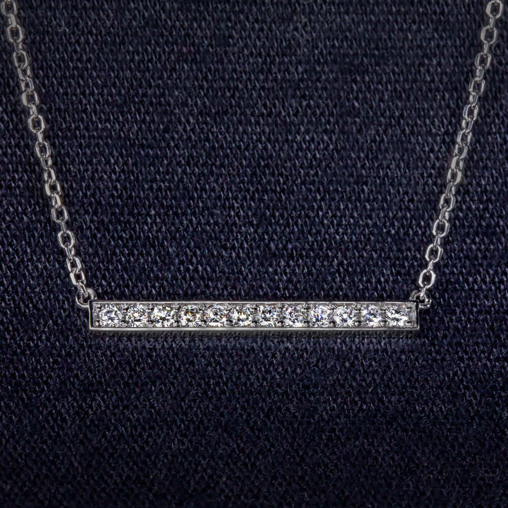 In an effortlessly elegant design, this stylish diamond necklace features a glittering bar pendant set with 0.36ct of vibrant and eye catching diamonds. The horizontal bar pendant hangs from a slender 14k white gold chain that creates an air of dainty minimalism while allowing the diamonds to take center stage. This necklace is the best of both worlds: elegant enough for special occasions but simple enough for everyday wear. You will absolutely fall in love with this necklace’s brilliant sparkle and graceful, versatile, simplicity.