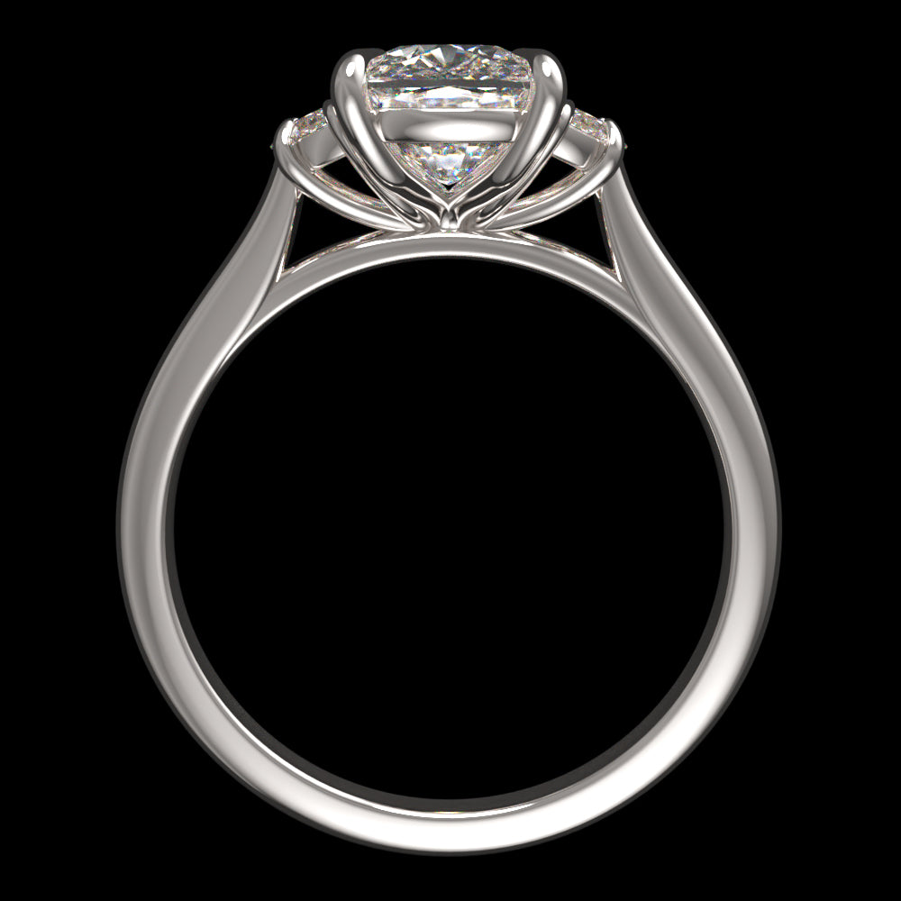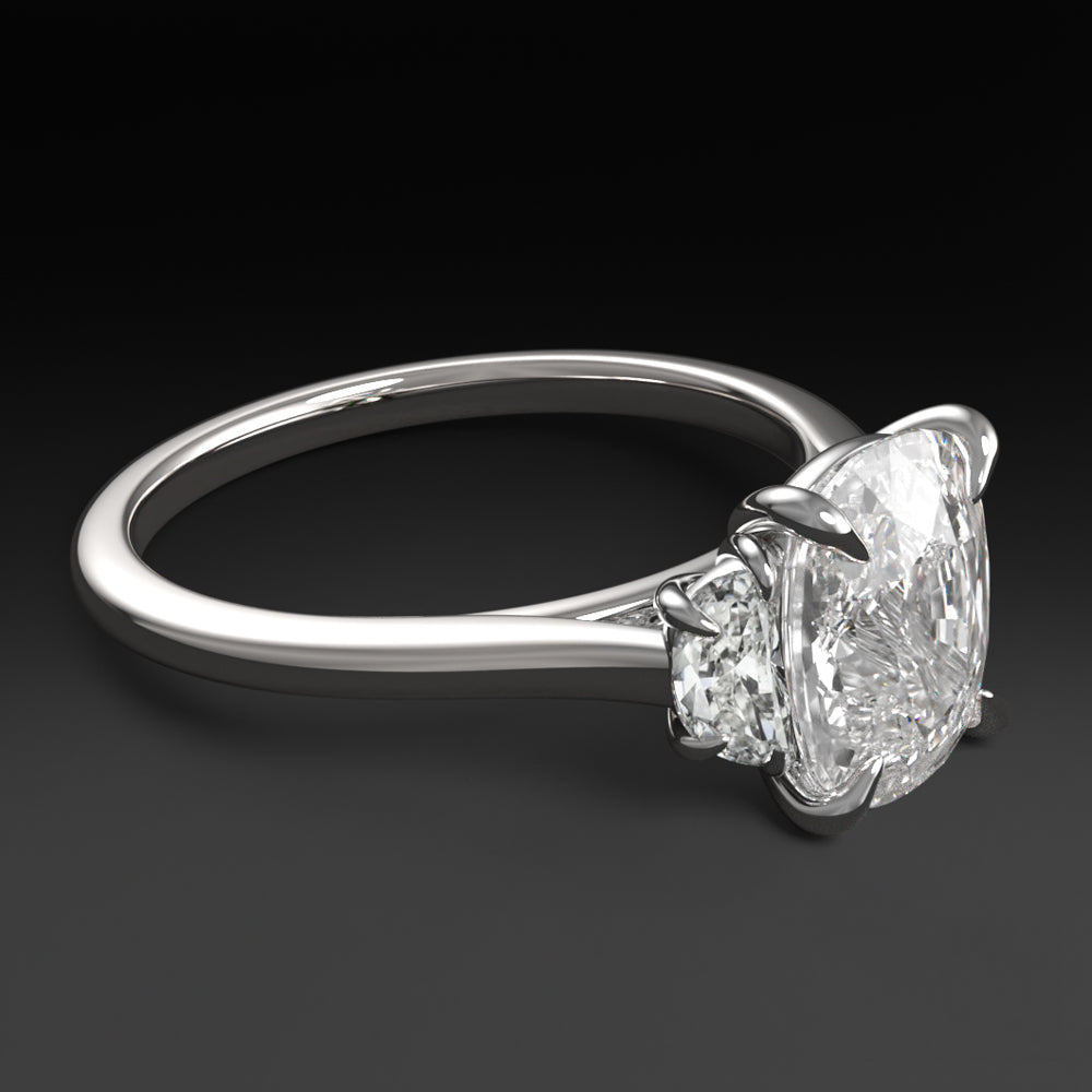 This three stone engagement ring is classic with a twist, featuring a substantial 2 carat lab grown diamond flanked by glittering half moon shape accent stones. It has an air of timeless sophistication that will stay forever in style!