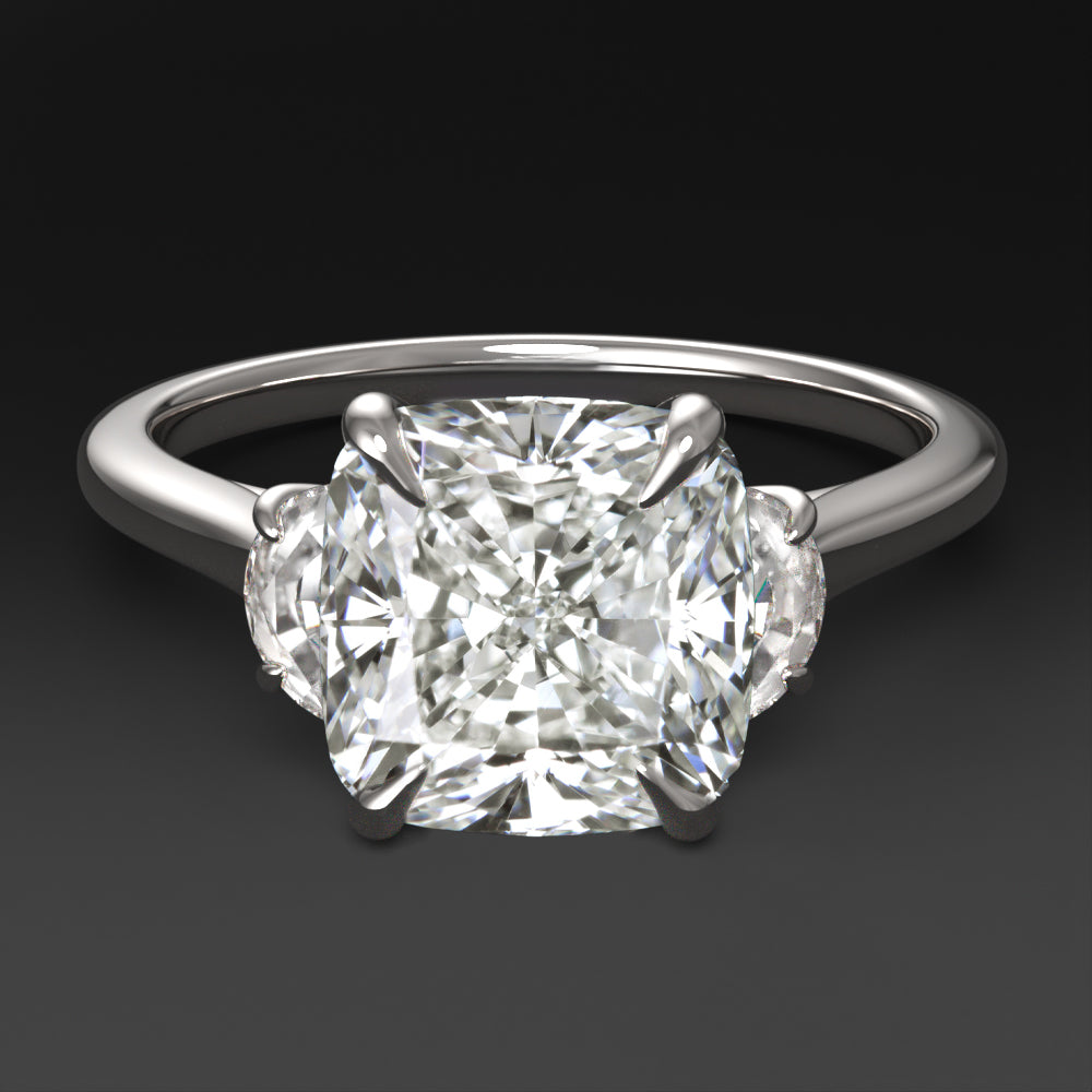 2ct LAB CREATED DIAMOND ENGAGEMENT RING 3 STONE CUSHION HALF MOON CUT WHITE GOLD