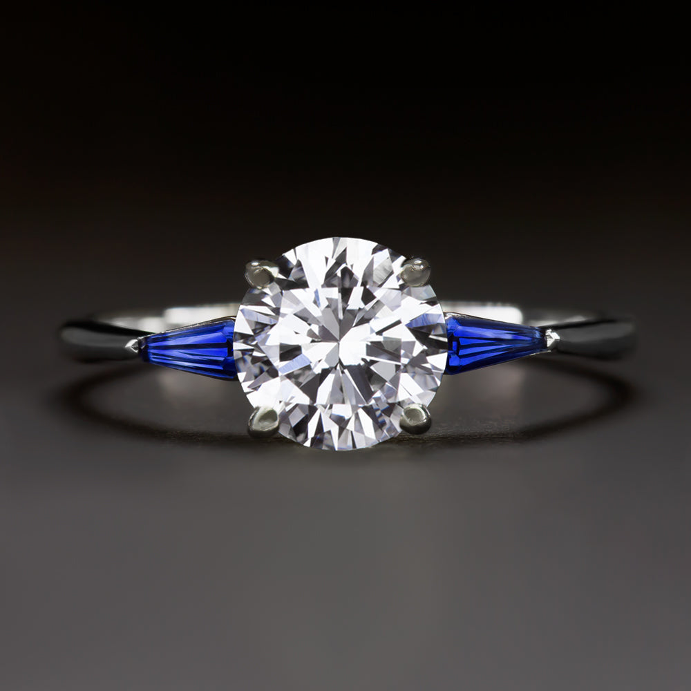 This striking diamond and sapphire ring features a high quality 0.93ct vintage round cut diamond flanked by royal blue kite shape sapphires.