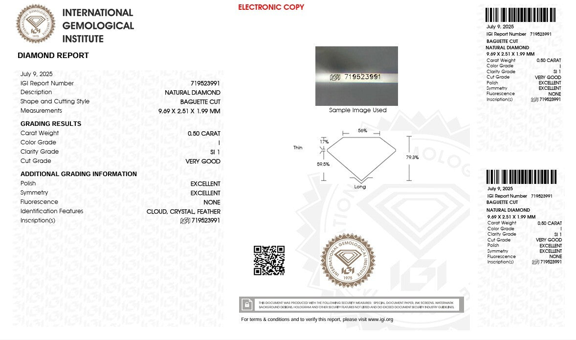 0.50ct IGI CERTIFIED DIAMOND BAGUETTE CUT I SI1 9.7mm LOOSE NATURAL LONG EMERALD