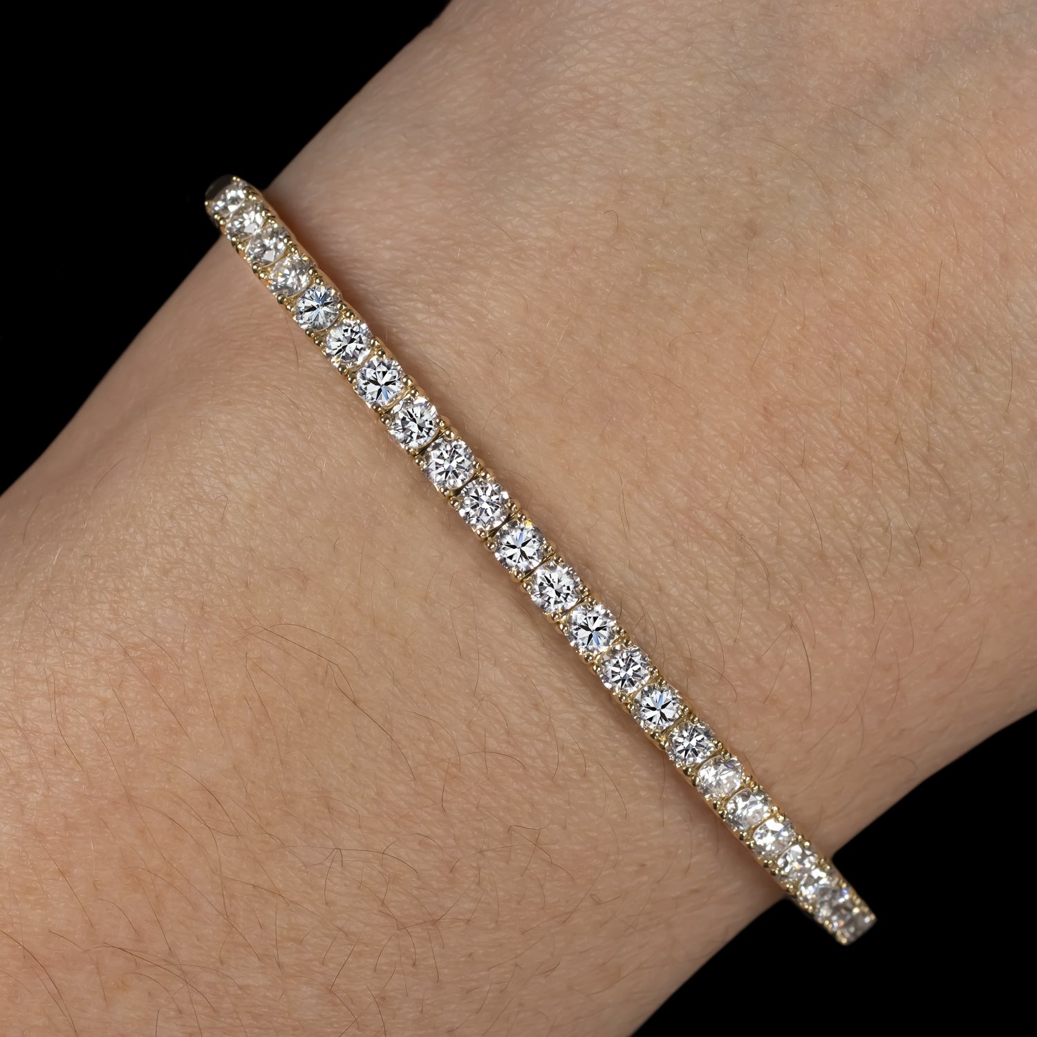 This elegant bangle bracelet has a classic design with a row of glittering lab diamonds set in 14k yellow gold.