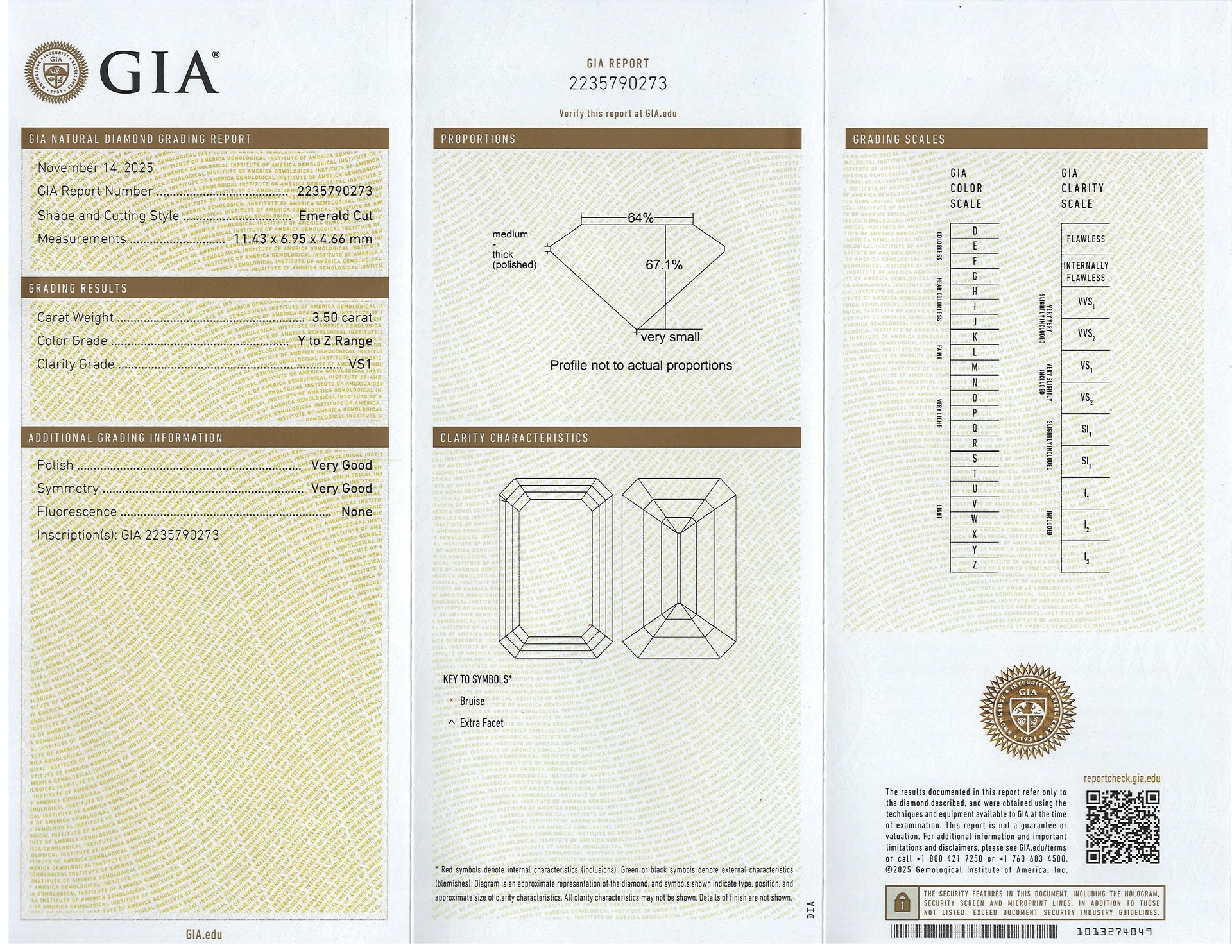 3.5 CARAT GIA CERTIFIED DIAMOND LIGHT YELLOW Y-Z VS1 EMERALD CUT LOOSE NATURAL