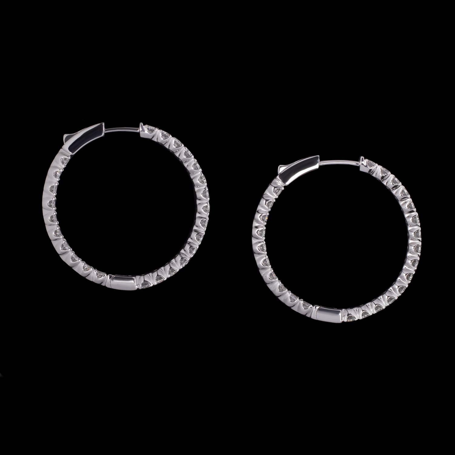 These stunning lab diamond hoops have a classic design and vibrant, lively sparkle! Set with 3.66 carats of lively diamonds, these earrings display eye catching sparkle, and a striking look! The elegant in and out design allows for maximum sparkle from the front.