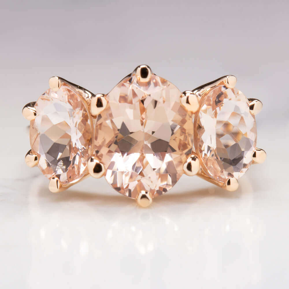 This gorgeous and eye catching ring features three natural pink-peach oval cut morganites set in a simply classic 14k rose gold setting. The size is fantastic totaling approximately 4.5 carats for the three stones. This stunning beauty is made in the USA, designed and crafted in our own Chicago shop! The morganites are a beautiful blush color reminiscent of rosé, and their well executed oval cuts display gorgeous sparkle. The oval cut is a fashionable and sought after shape with a flattering look on the finger and excellent coverage. This gorgeous set of three morganites works together beautifully as a three stone rings and has a glamorously large look! The blush warmth of the 14k rose gold setting blends beautifully with the peach morganite, and the effortlessly elegant design will remain forever in style. Glamorously impressive in size with gorgeous color, this stunning ring is an excellent choice for an eye catching cocktail or engagement ring!