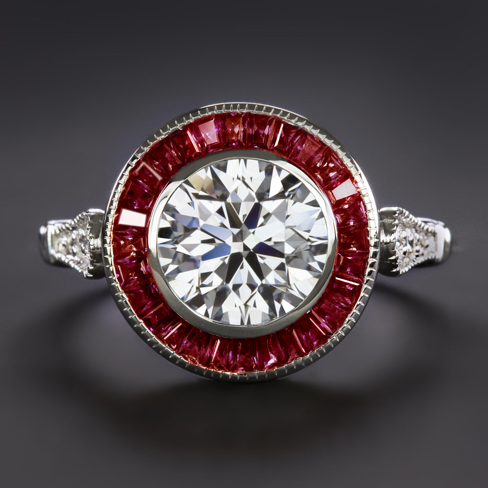 This lab grown diamond and ruby ring has a classic Art Deco style target design! It offers rich color and gorgeous, substantial sparkle! It is an excellent choice for an engagement or cocktail ring.