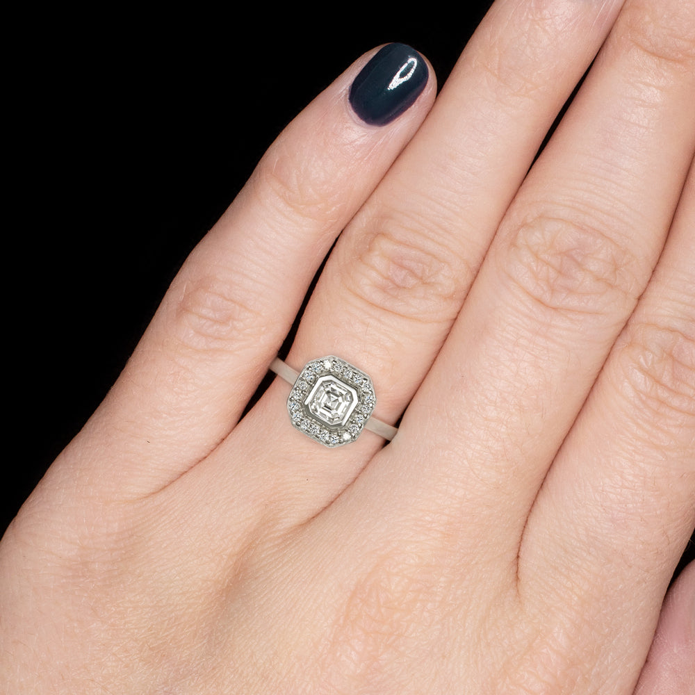 Crisp and colorless, the 0.80ct center diamond is graded E-F for color. It is just a couple very subtle shades away from perfect D color. For clarity it is graded VS1. Even under 10x magnification, there are no visible inclusions. The diamond’s emerald cut is gorgeously sophisticated with bright and lively sparkle. The accent diamonds are bright white and eye clean, graded F-G for color and VS1-SI1 for clarity. The mounting is made of solid 18k white gold. The ring measures a substantial 10.7mm across (north to south) and 6.2mm from finger to top.