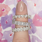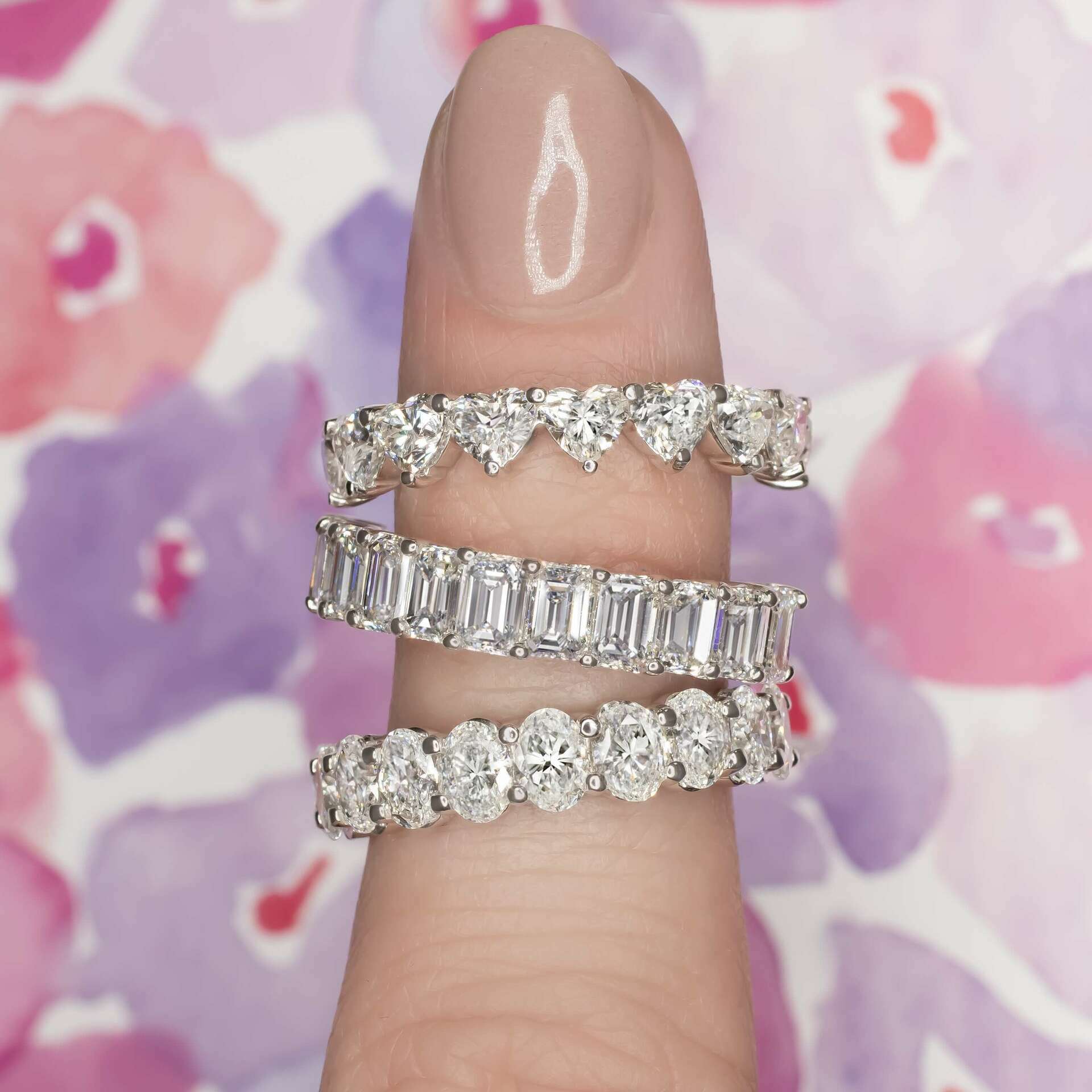 This striking and very high quality ring features 2 carats of heart shape diamonds set in an elegantly simple modern band. Nine high quality, perfectly matched, and substantially sized GIA certified diamonds cover the face of the ring in dazzling sparkle. Their lively heart shaped cuts add a playful element to this classic ring. It is a great choice for a wedding band or a stand alone piece.