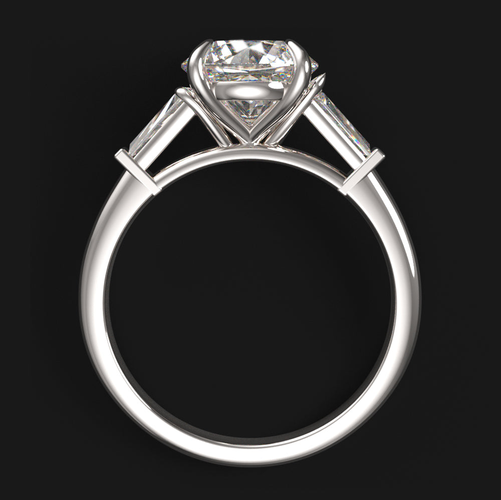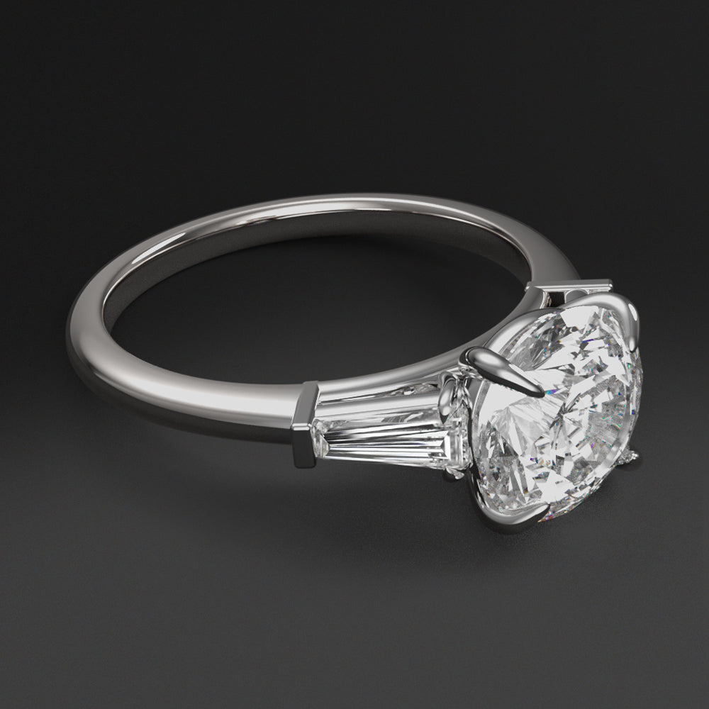 This three stone engagement ring is utterly classic featuring a substantial 2 carat lab grown diamond flanked by glittering tapered baguette accent stones. It has an air of timeless sophistication that will stay forever in style!