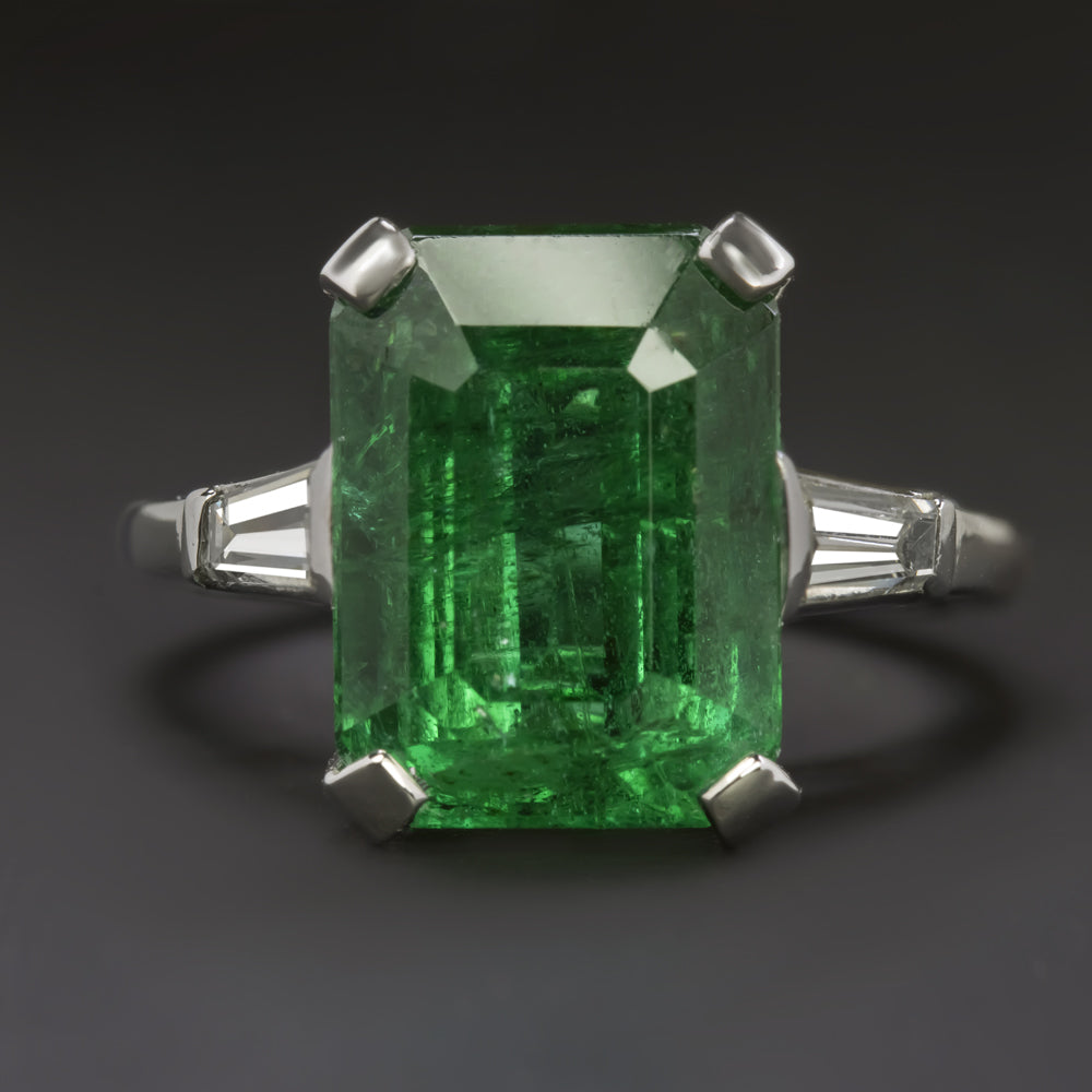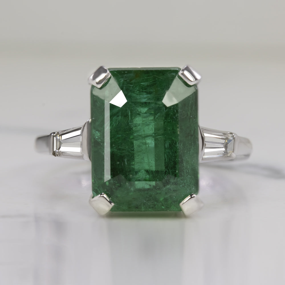 This emerald and diamond ring features a large and high quality 6.07ct emerald flanked by a pair of tapered baguette diamonds for a sleek and sophisticated finish.