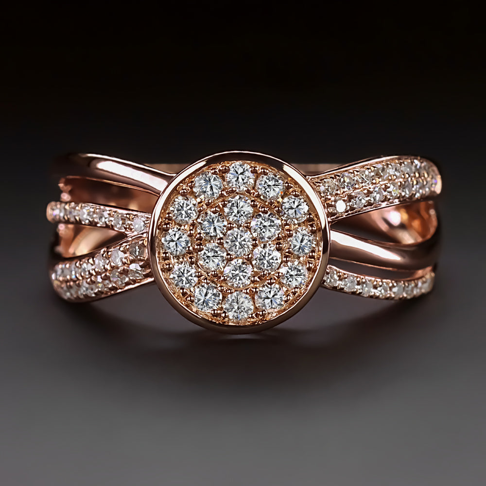 This vintage designer ring bears the EFFY hallmark and is luxuriously designed with an eye catching pave diamond center and a criss crossing split shank design! Between the glittering diamonds and substantial 14k rose gold setting, this ring has an air of glamour and luxury!