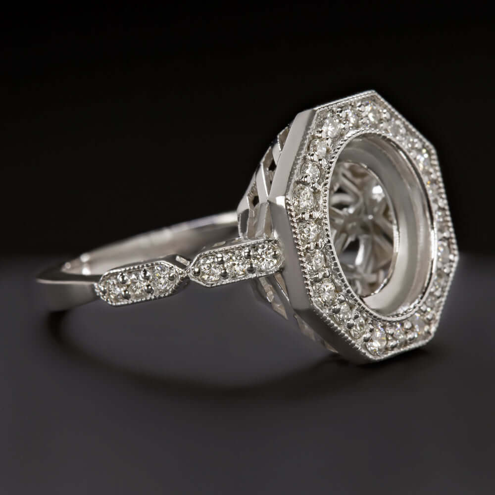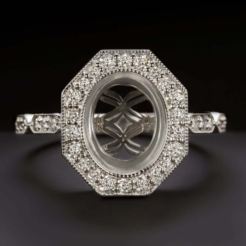 This gorgeous vintage inspired semi-mount is beautifully designed to capture the glamour and romantic style of vintage design! The octagonal halo gives this ring a touch of vintage flair and an air of Art Deco glamour. The ring’s shoulders are set with additional brilliantly white and vibrant natural diamonds. Finished with fine milgrain details, this setting provides the perfect backdrop for a diamond or gemstone of your choice. The setting can fit an oval cut center stone with an ideal size of 10x8mm. It can accommodate a 0.2mm variance in either direction. For a small fee, we can modify the setting to fit stones of other dimensions. Please contact us if you would like this setting modified or are looking for a diamond or gemstone to be set in the center. We offer a large selection of loose diamonds and gemstones and would be happy to assist you in finding a center to complete this ring. Additionally, as a custom jewelry manufacturer, we do offer stone setting services to complete the finished product.