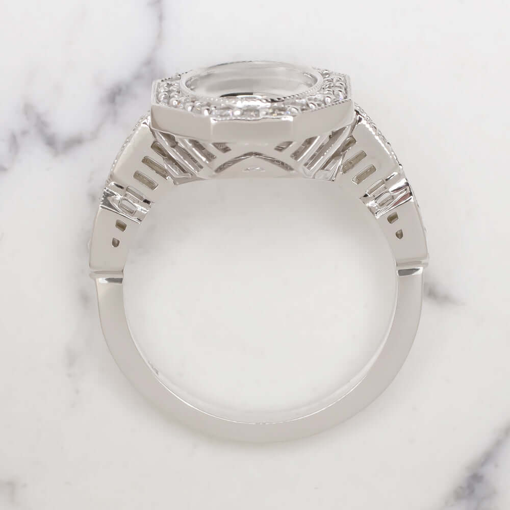 Eye catching and classically fashionable, this setting beautifully captures the class and glamour of Art Deco design! Set with a center stone of your choice, it would make a gorgeous engagement or cocktail ring!
