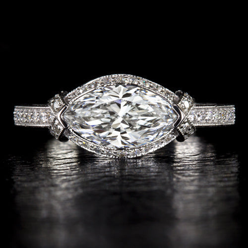 EAST WEST MARQUISE LAB CREATED DIAMOND ENGAGEMENT RING VINTAGE STYLE WHITE GOLD