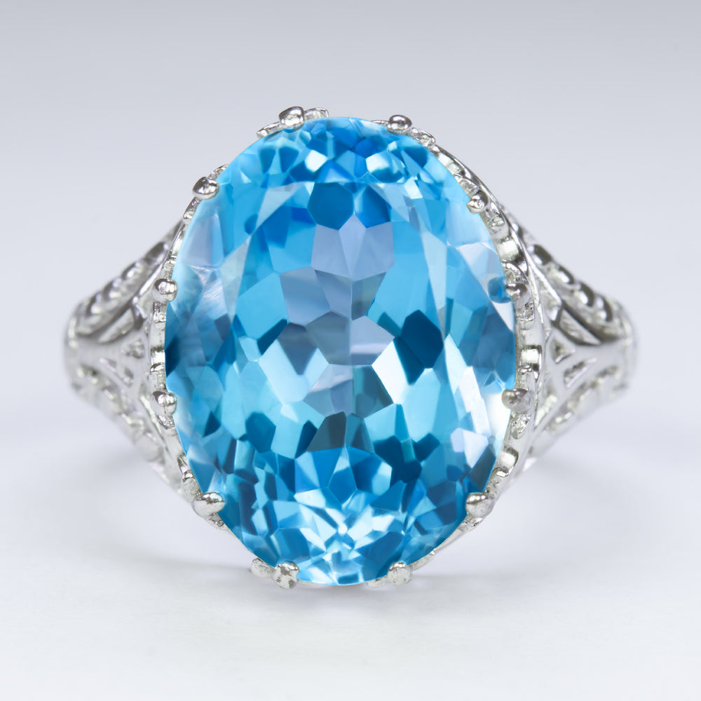 LONDON BLUE TOPAZ STERLING SILVER VINTAGE STYLE RING FILIGREE OVAL CUT SOLITAIRE