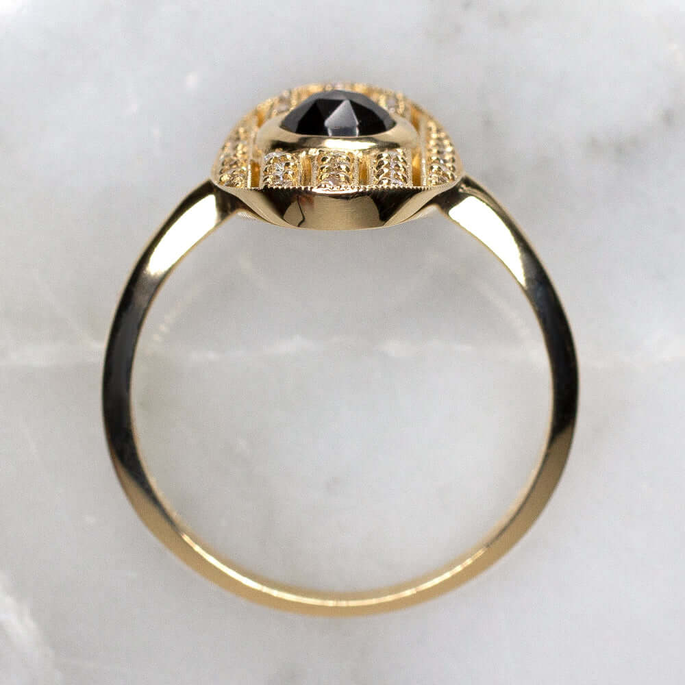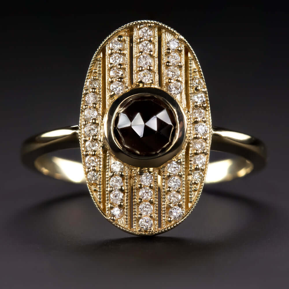 A beautiful combination of vintage and modern design, this ring offers eye catching contrast, rich color, and vibrant sparkle. A round rose cut black spinel is set in a sleek bezel setting surrounded by a stylish oval design sparkling with brilliantly white and vibrant natural diamonds. Finished with fine milgrain details and elegant striped cut-outs, the setting is beautifully crafted in the Art Deco style! The rich warmth of the 14k yellow gold contrasts stunningly with the bright white of the diamonds and the deep black of the spinel. The result is a striking cocktail ring that will bring a unique touch along with timeless glamour to your wardrobe!