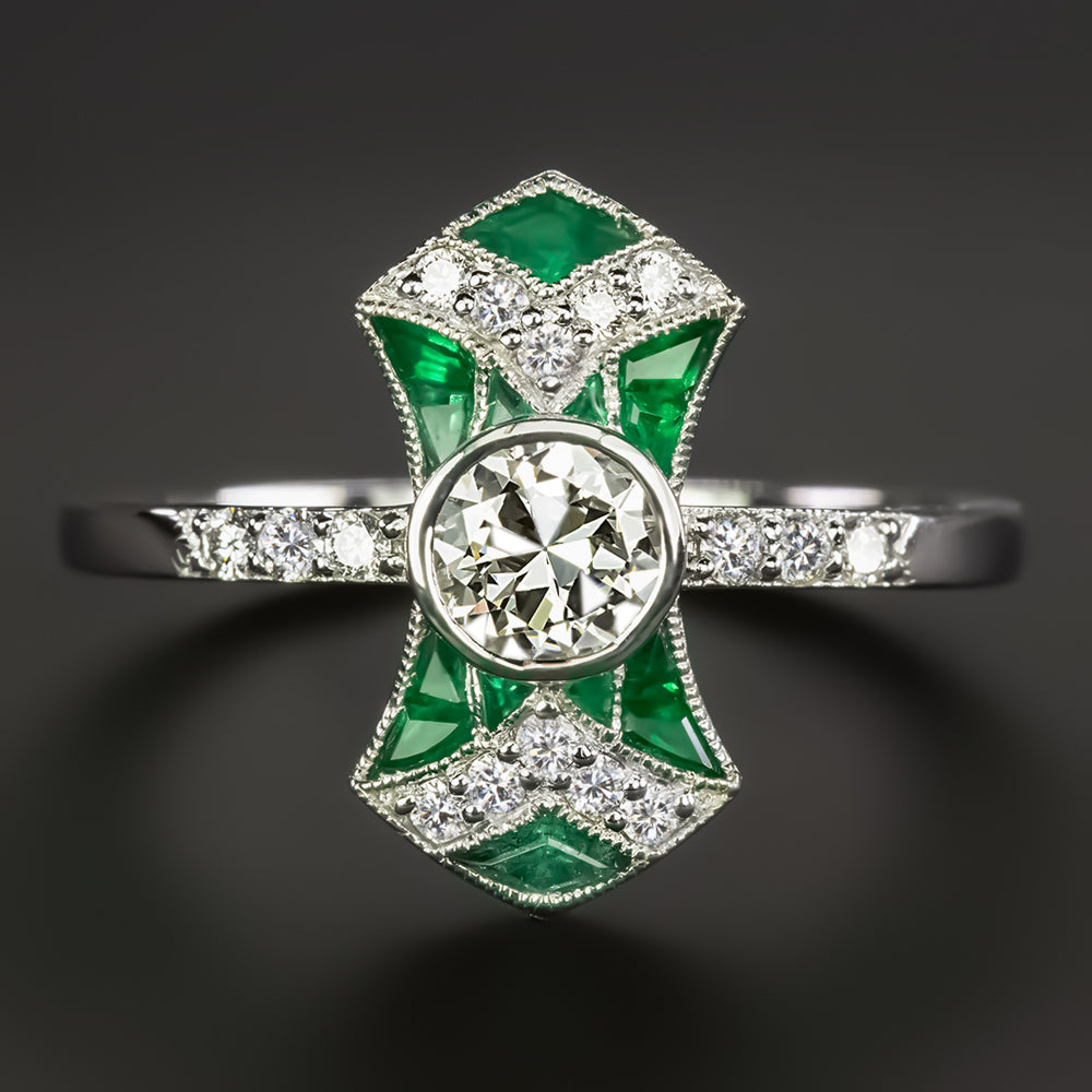 This diamond and emerald ring features an original vintage old European cut diamond and offers a stunning Art Deco style design with rich color, and gorgeous sparkle!