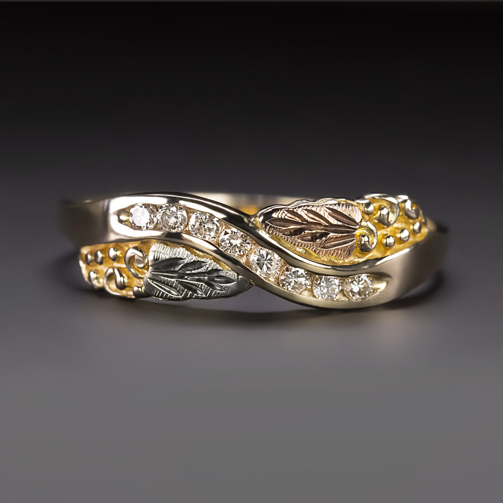 This vintage diamond band has a unique design with rose and green gold leaf accents!