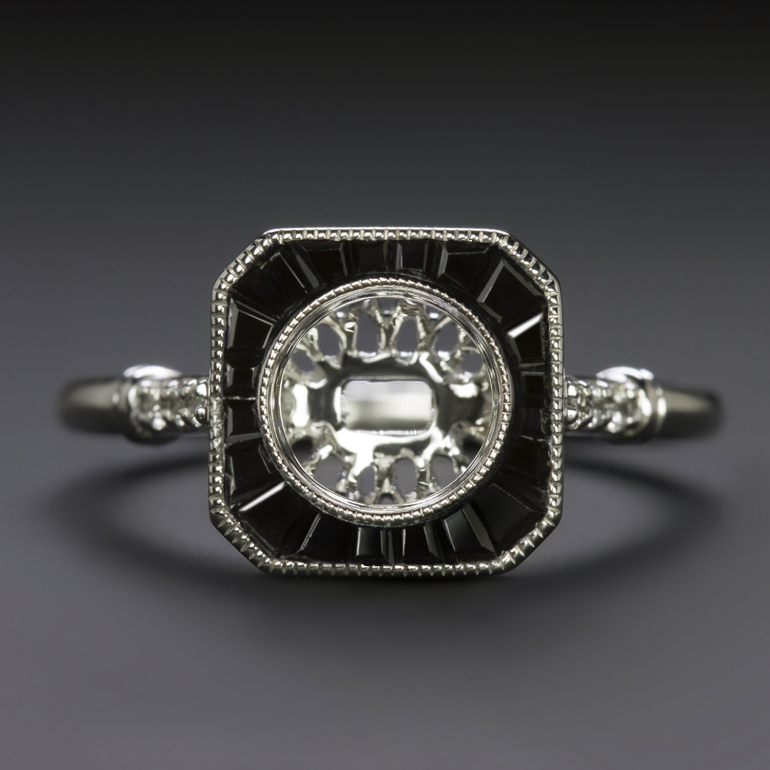 VINTAGE STYLE BLACK ONYX HALO ENGAGEMENT RING SETTING ROUND BEZEL WHITE GOLD