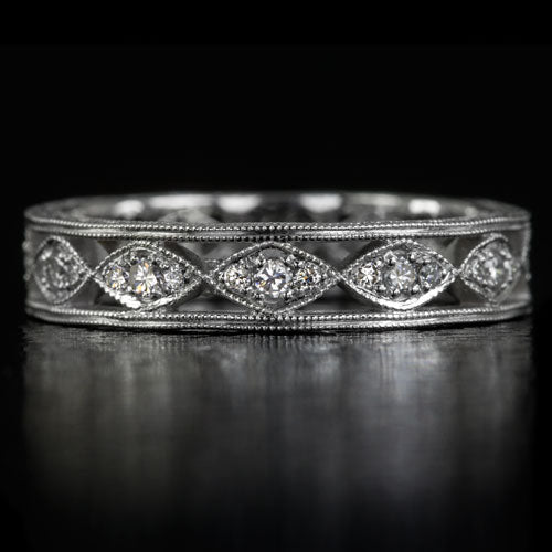 Featured here is a fabulous vintage inspired diamond eternity band! This sparkling piece will make a wonderful wedding band or stackable right hand ring! This ring has an open filigree design and it is set with 0.30ct of fully faceted round cut diamonds that are white, showing no color, and they are 100% clean to the naked eye with no visible inclusions. The stones are set in this solid platinum ring, designed with Art Deco era inspiration. The measurements are 4.2mm across (north-south) and 1.7mm from the finger to the top of ring. It's a great size with substance and comfort in mind. It is a finger size 6.5 and it can be resized upon request. This is an eternity ring with a small sizing bar to be worn at the back of the hand. Make this beautiful vintage inspired diamond eternity band part of your collection! All of our pieces come with a 100% satisfaction guarantee and 14 day return policy. An appraisal is available upon request.