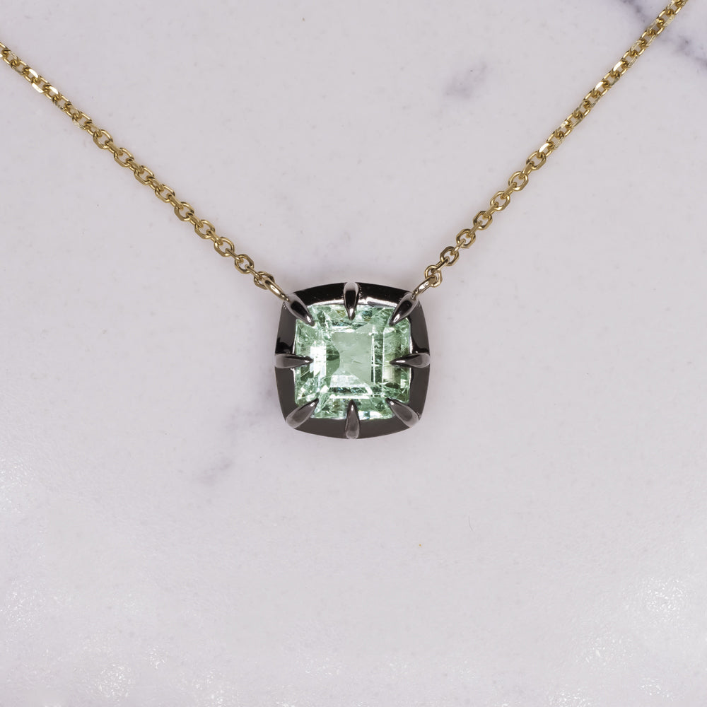 This emerald solitaire necklace provides a classic look that you’ll find yourself reaching for everyday! The prong setting is inspired by Victorian era collet settings and is finished with black rhodium to create the look of an era appropriate patina.