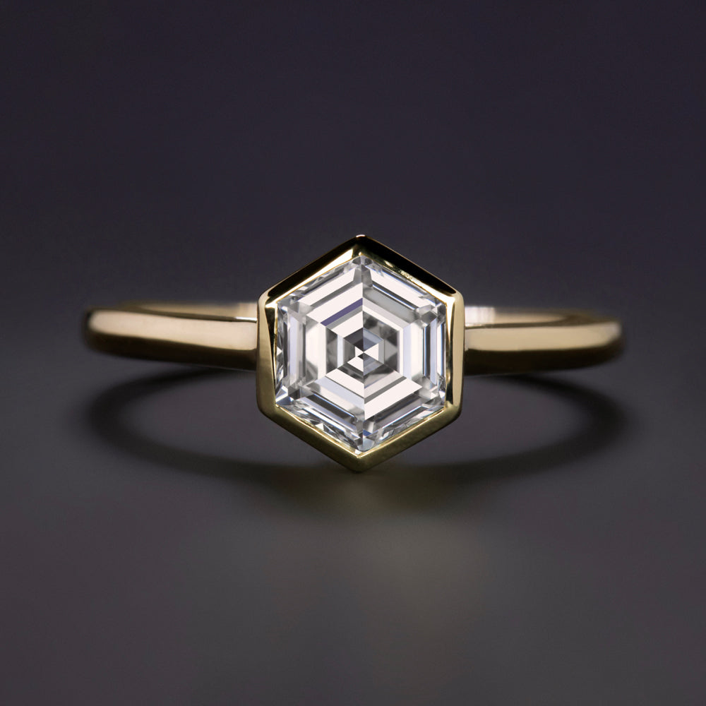 1ct LAB CREATED DIAMOND ENGAGEMENT RING BEZEL HEXAGON 14k YELLOW GOLD SOLITAIRE
