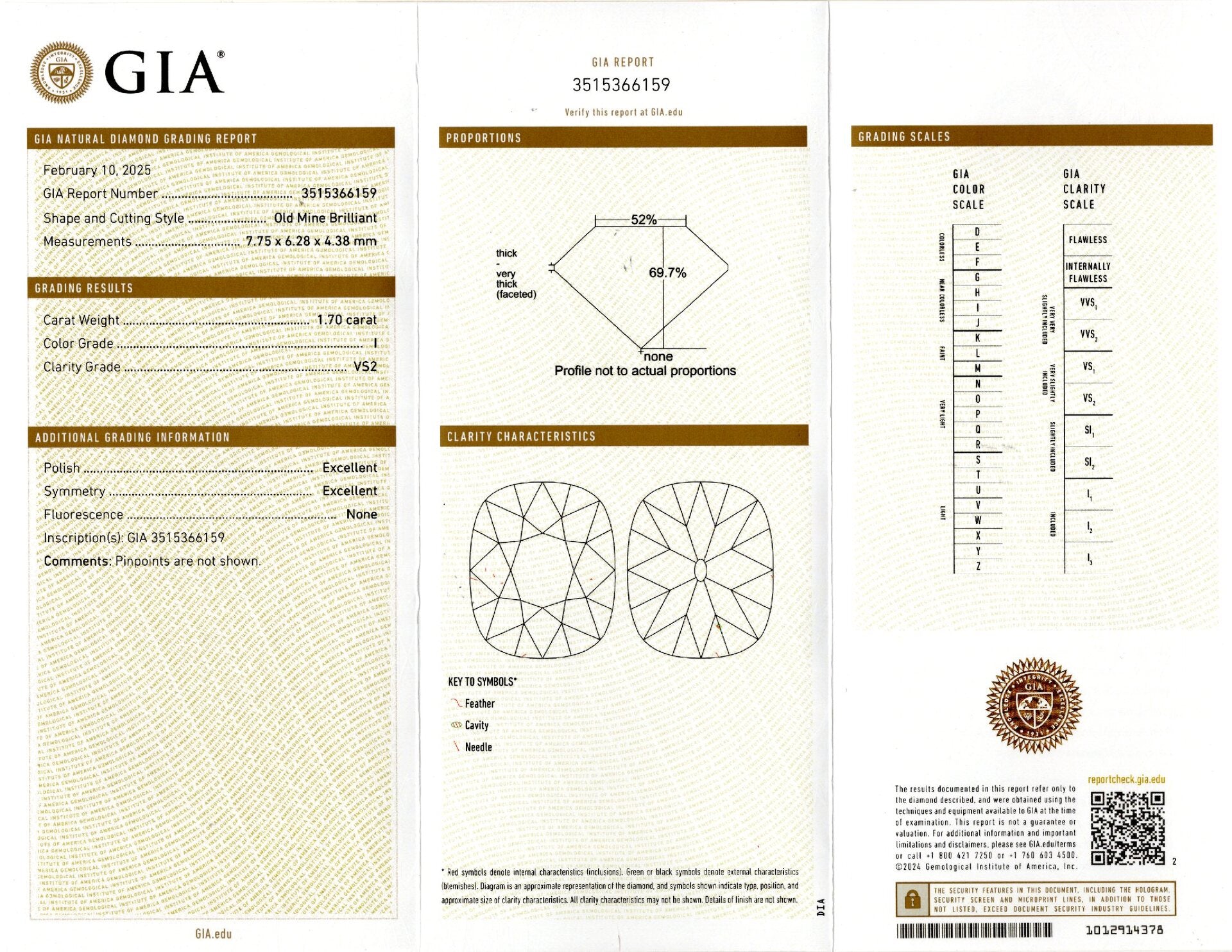 1.70ct OLD MINE CUT DIAMOND GIA CERTIFIED I VS2 ANTIQUE STYLE ELONGATED CUSHION