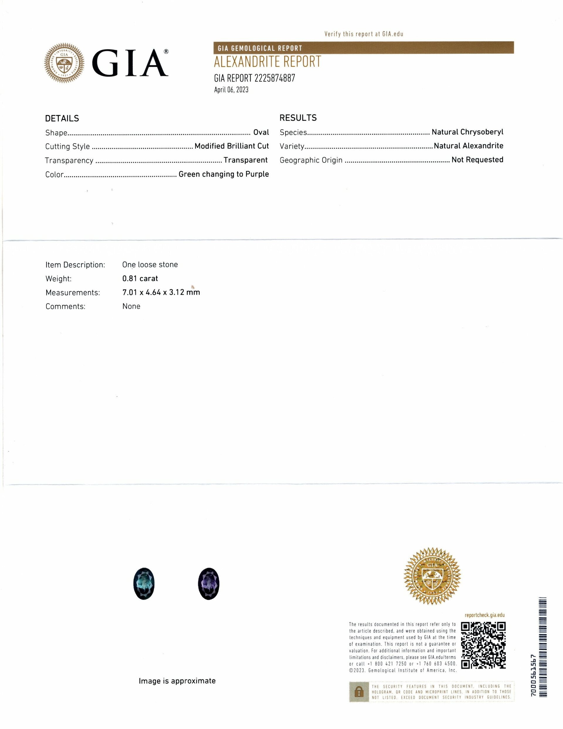 ALEXANDRITE GIA CERTIFIED GREEN TO PURPLE LONG OVAL NATURAL COLOR CHANGE 0.81ct