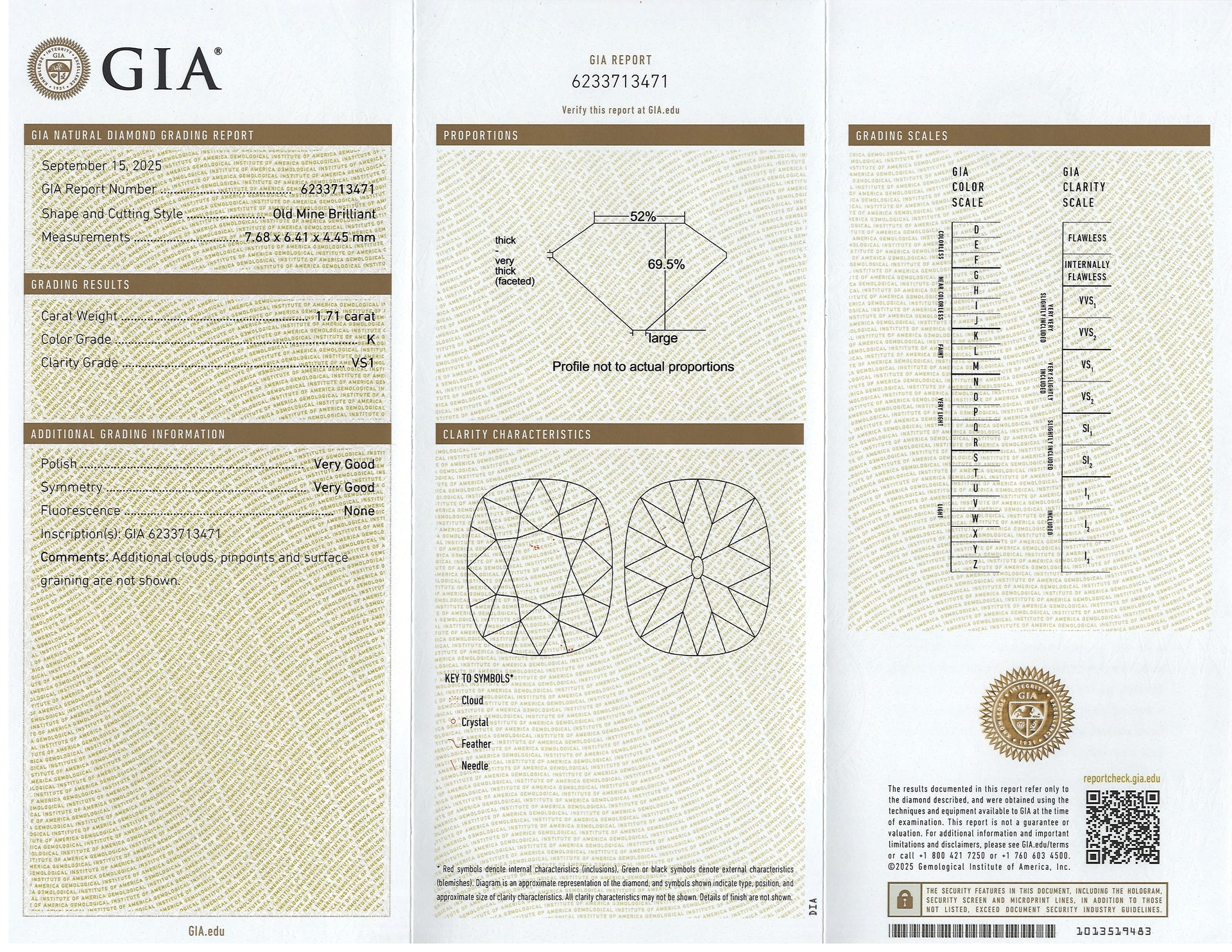 1.71ct OLD MINE CUT DIAMOND GIA CERTIFIED K VS1 ELONGATED CUSHION BRILLIANT