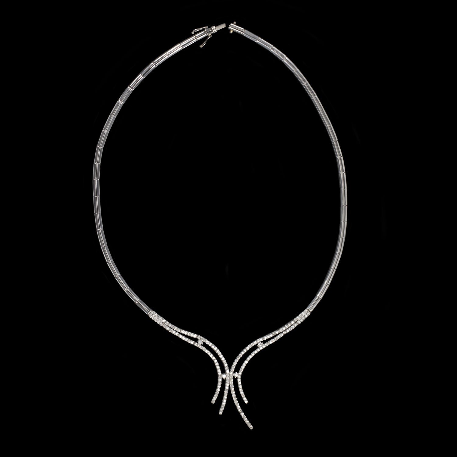 This elegant diamond necklace is crafted in high quality 14k white gold with graceful diamond encrusted curves!