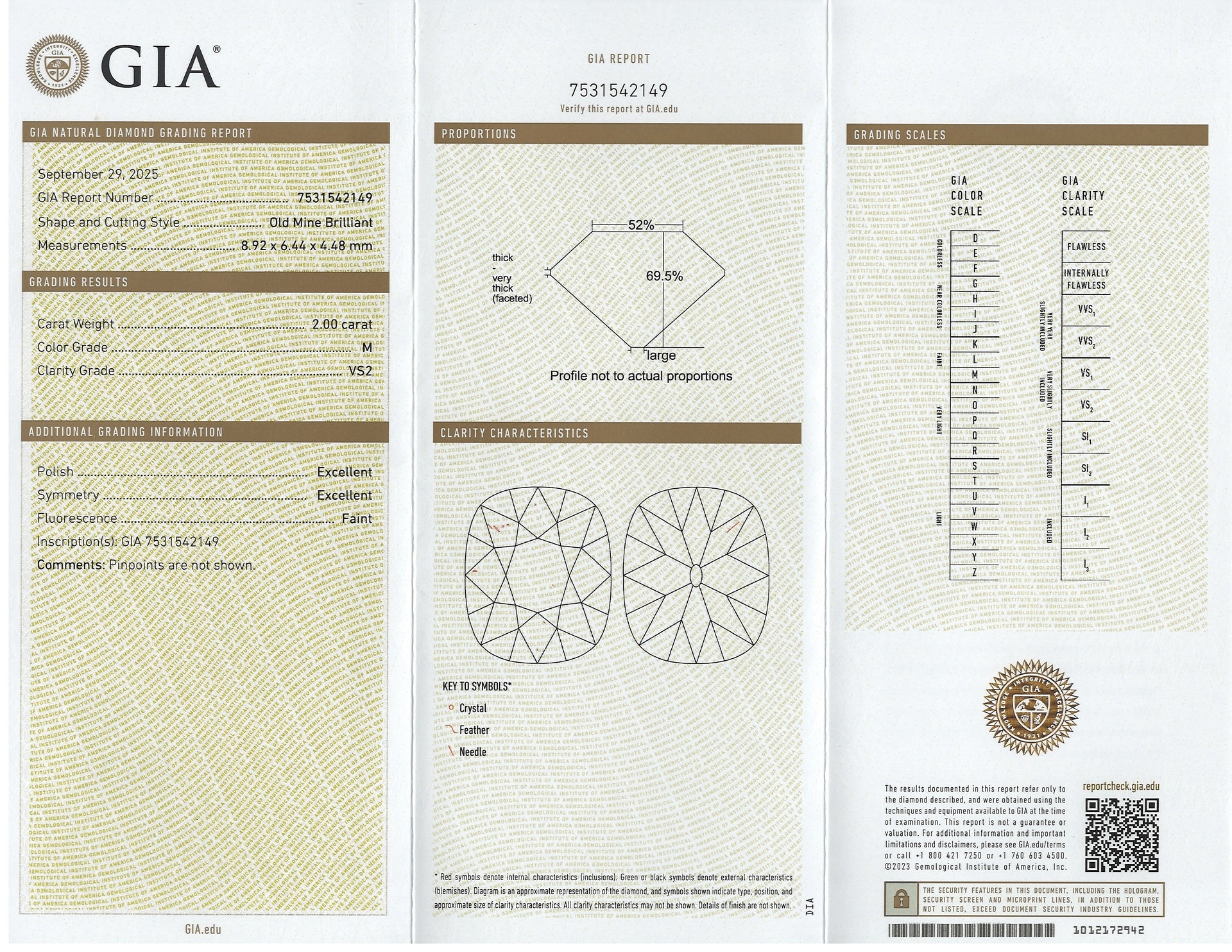 2 CARAT OLD MINE CUT DIAMOND GIA CERTIFIED M VS2 ANTIQUE STYLE ELONGATED CUSHION