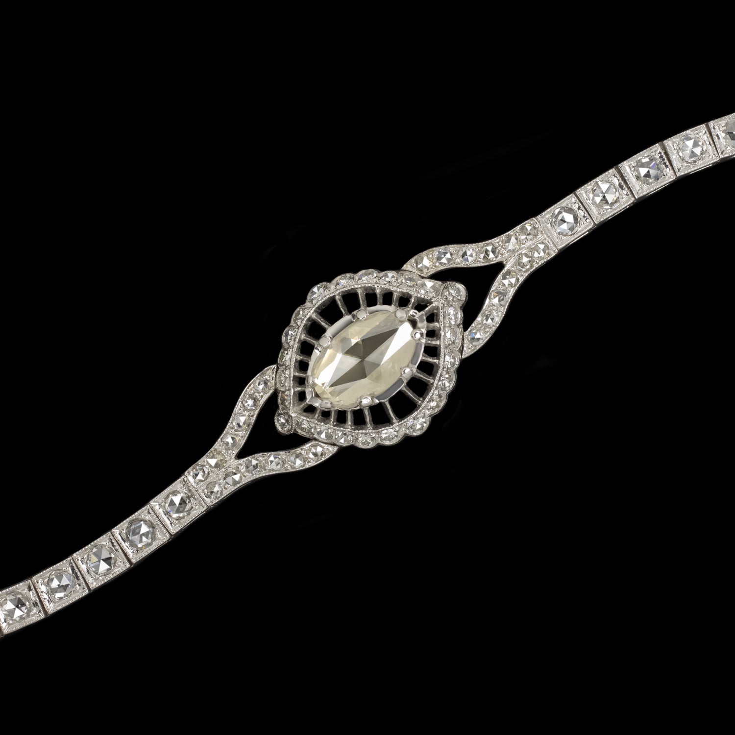 Crafted around the turn of the 19th to 20th century, this vintage diamond bracelet is a very rare find with a stunning array of rose cut diamonds and gorgeous hand perfected details!