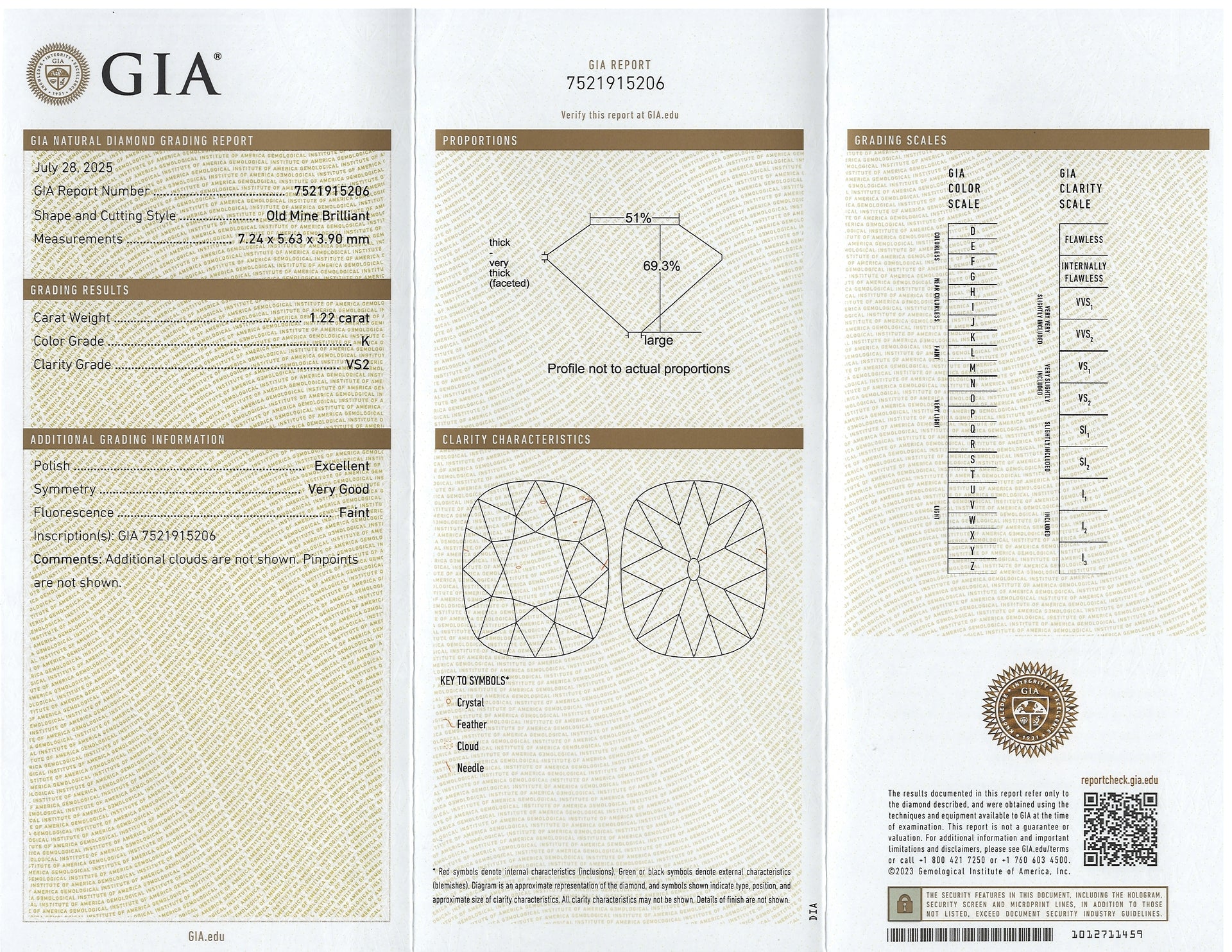 1.22ct OLD MINE CUT DIAMOND GIA CERTIFIED K VS2 ELONGATED CUSHION BRILLIANT