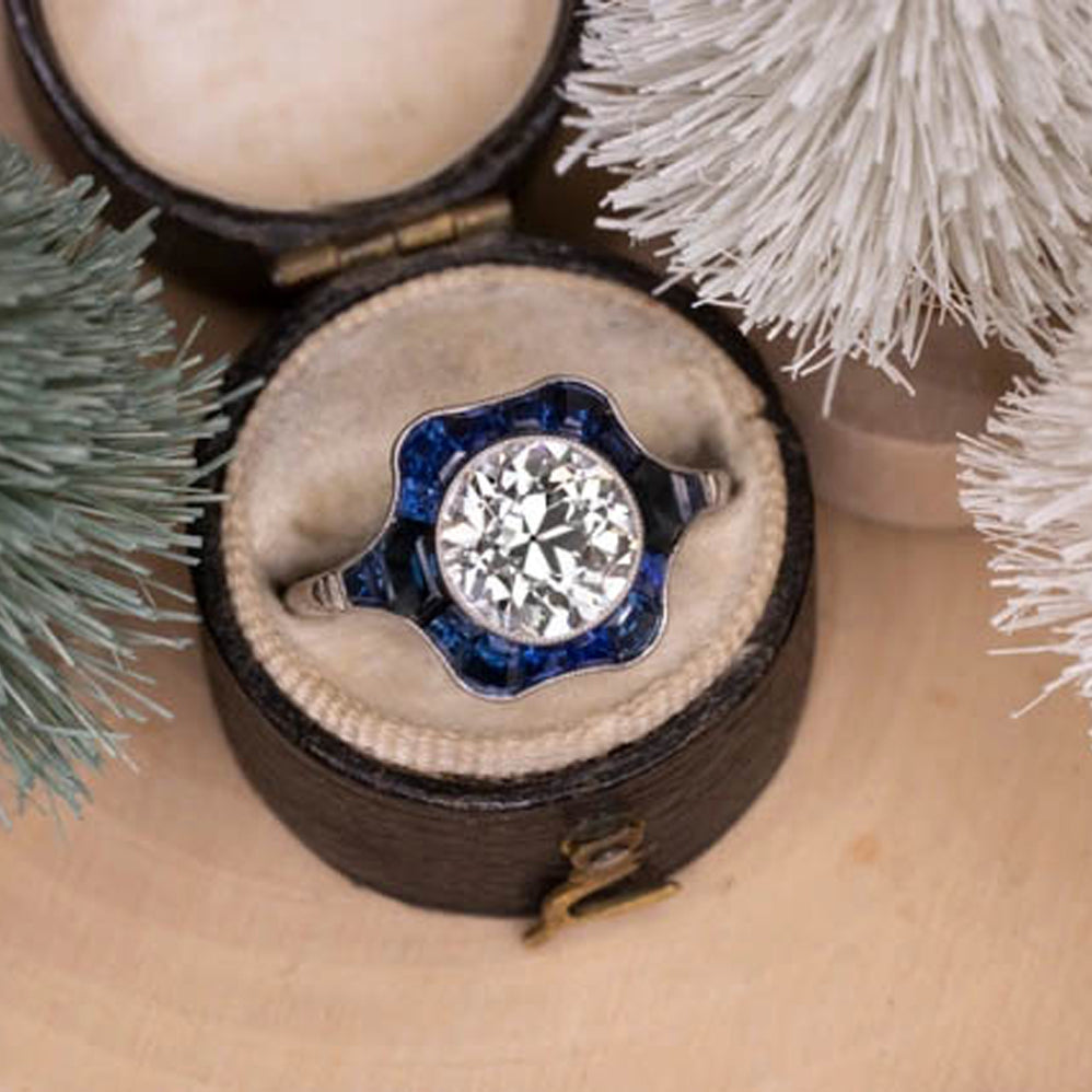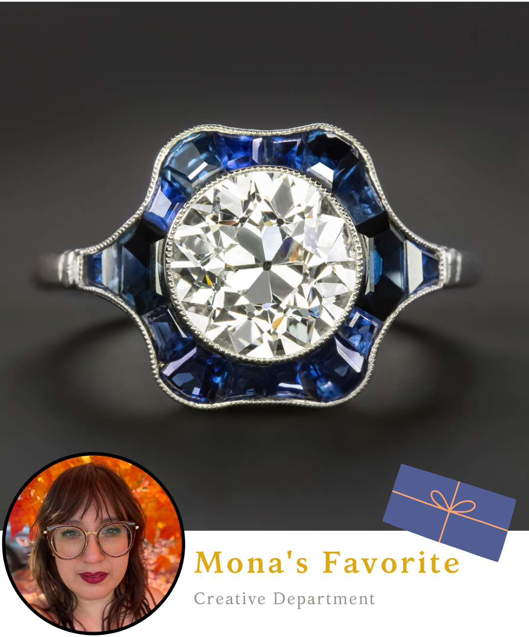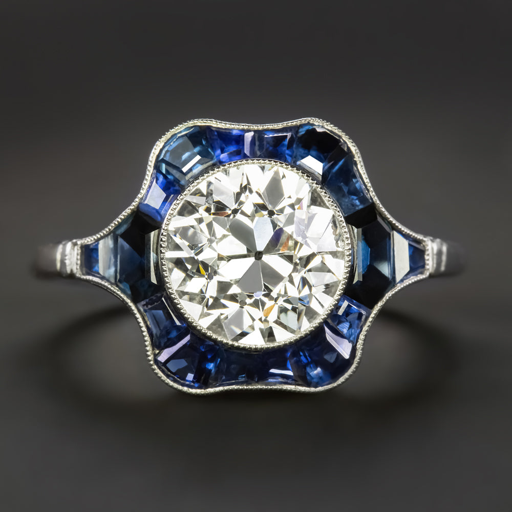 The 2.27 carat old European cut diamond offers bright, bold sparkle, and the scalloped sapphire border adds a unique touch!
