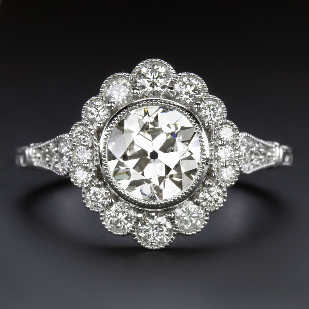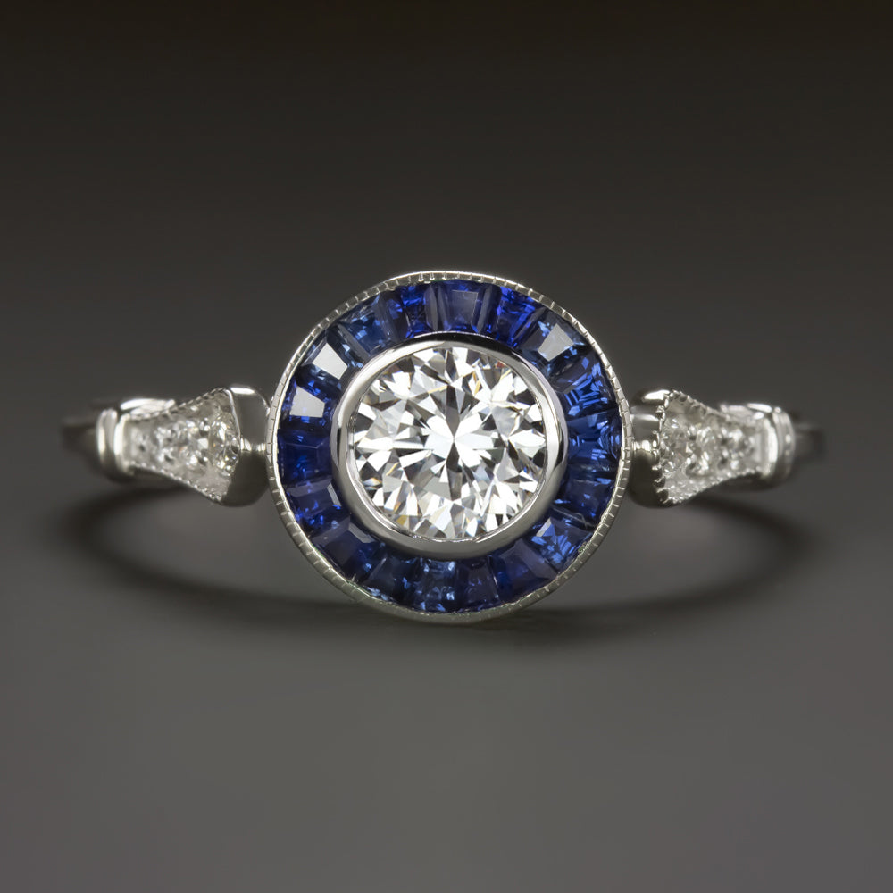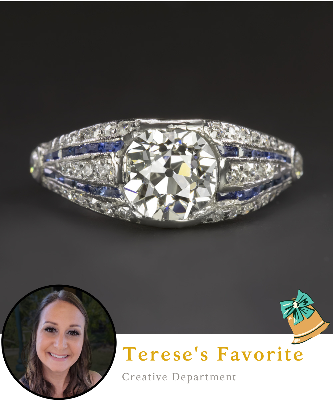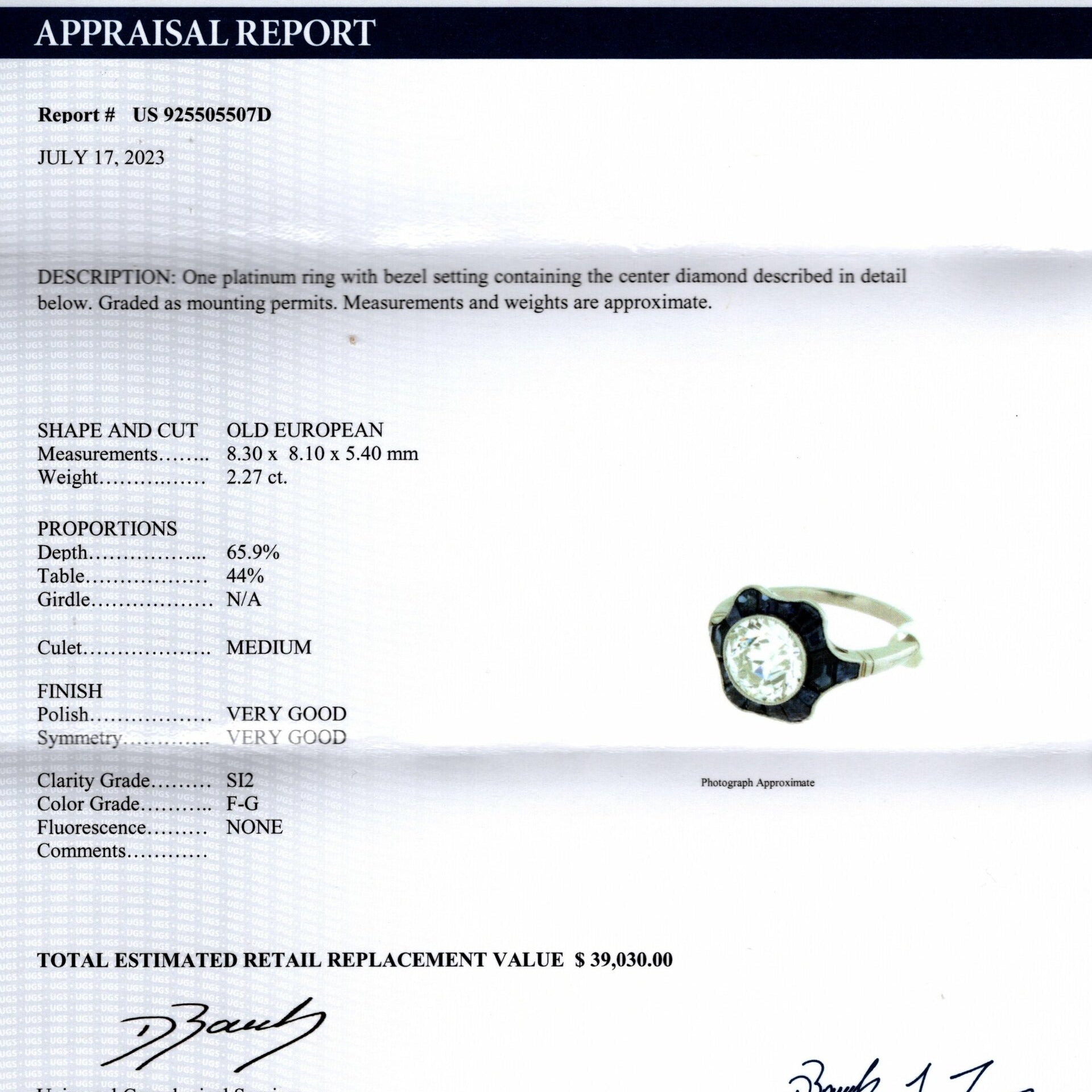 The 2.27 carat old European cut diamond offers bright, bold sparkle, and the scalloped sapphire border adds a unique touch!