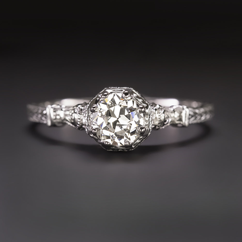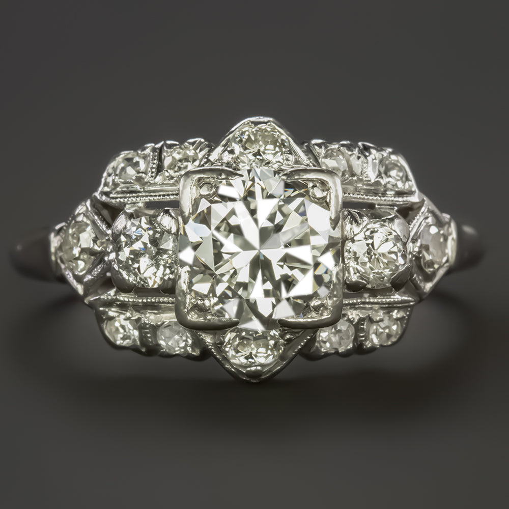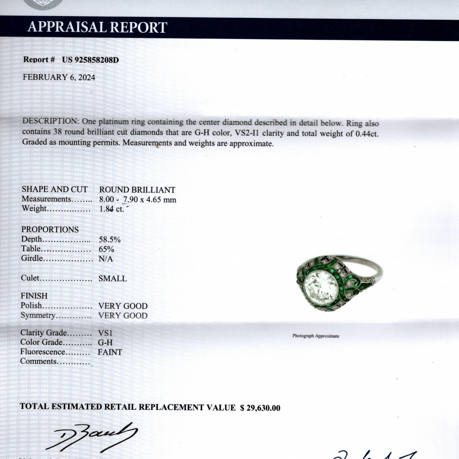 This is an original vintage ring from the Art Deco period that has a very high quality old mine cut diamond in the center. The diamond is accented with lovely green baguettes and vintage diamonds. I love the green side stones as it really sets this ring apart! Its a true one of a kind.