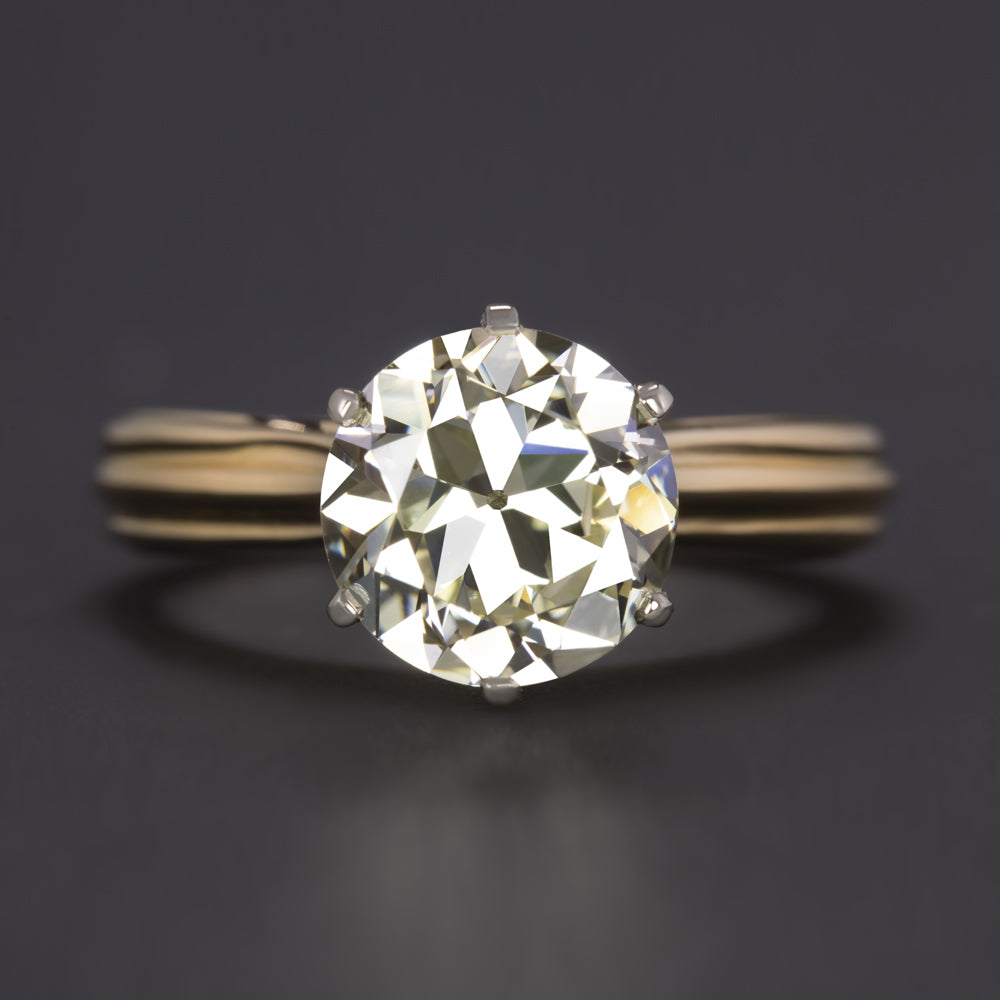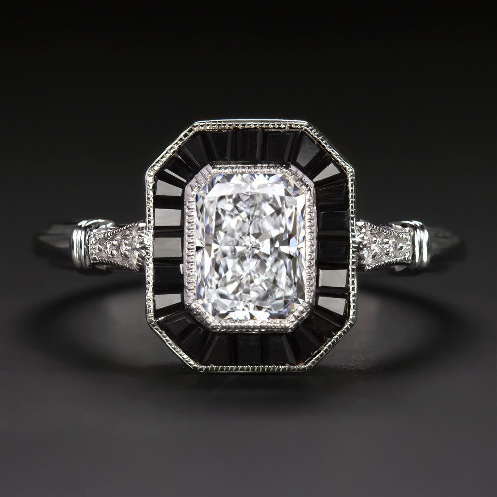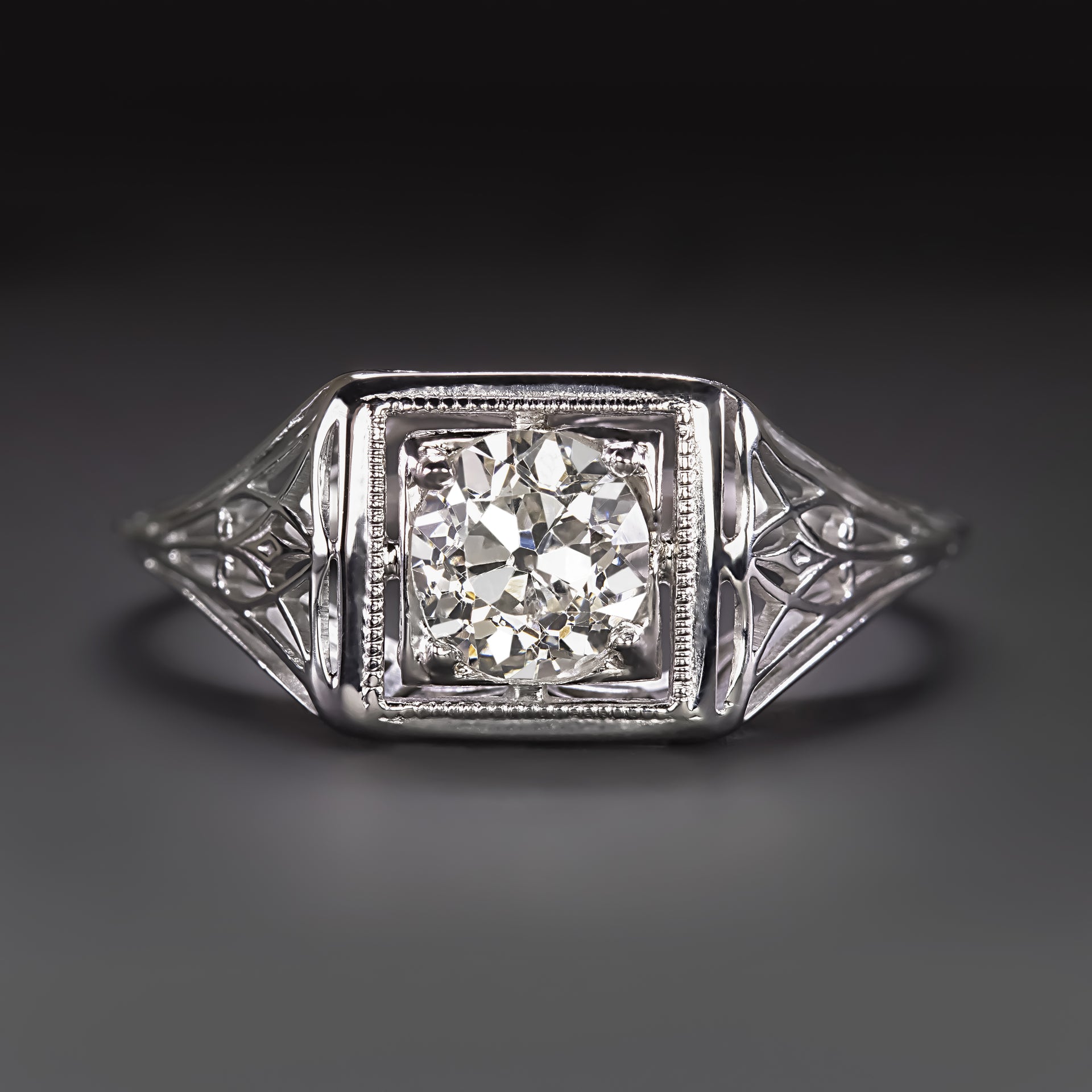 This is an original vintage ring from the Art Deco period that has a very high quality old mine cut diamond in the center. The diamond is accented with lovely green baguettes and vintage diamonds. I love the green side stones as it really sets this ring apart! Its a true one of a kind.