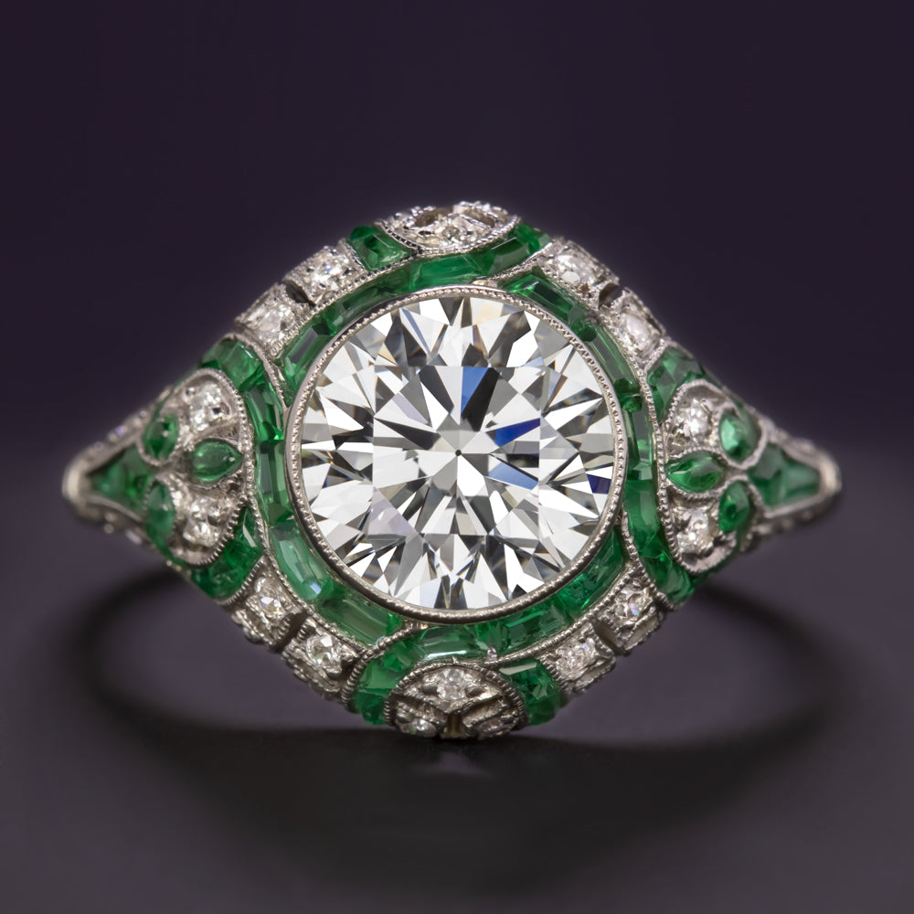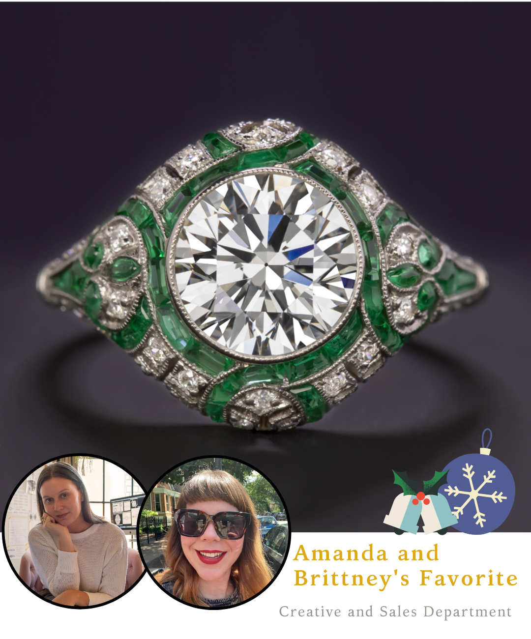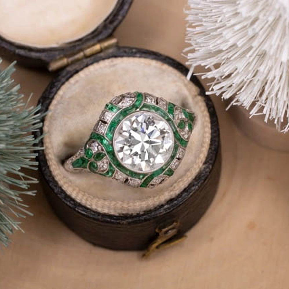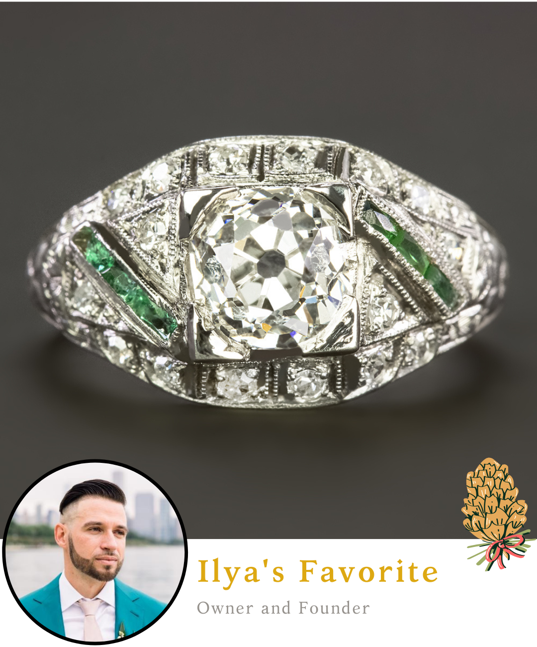 Beautiful vintage diamond center stone surrounded by custom cut emeralds scattered with bright white diamonds. Incredible detail and masterfully crafted that would be very hard to say no to! - Brittney