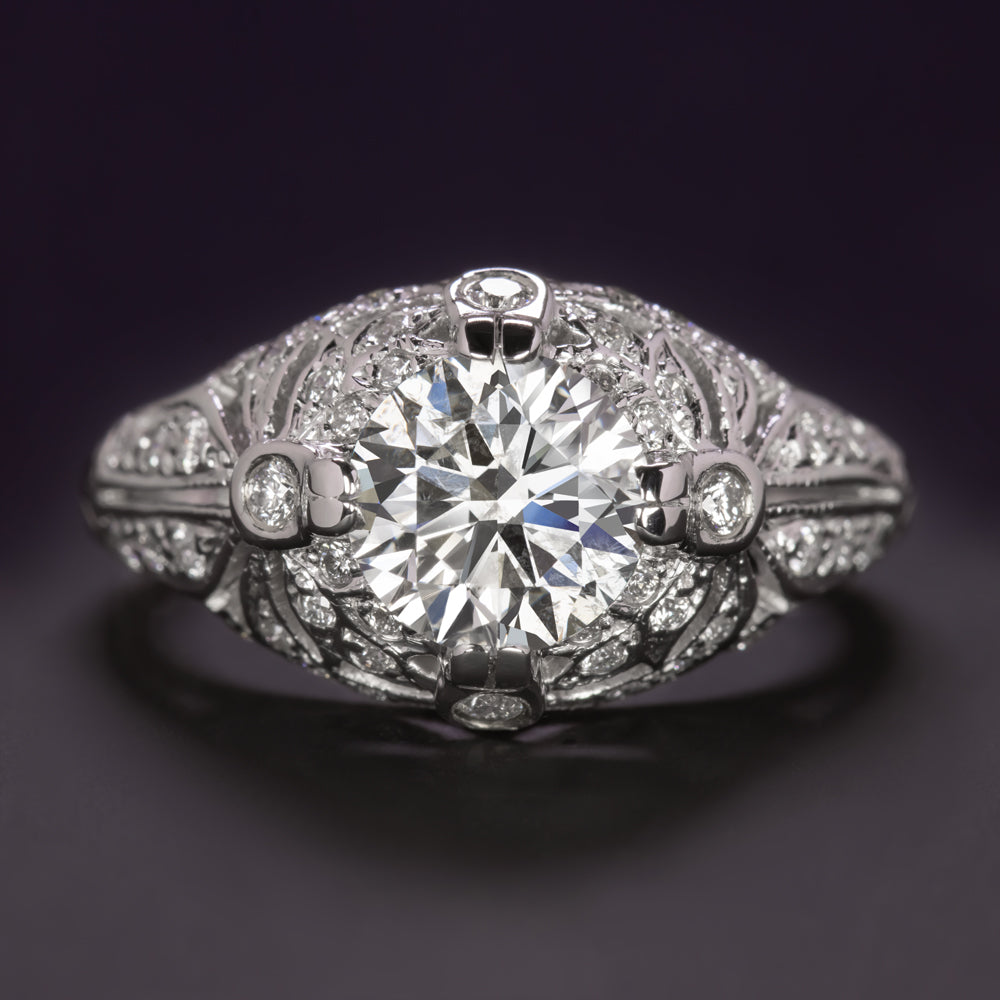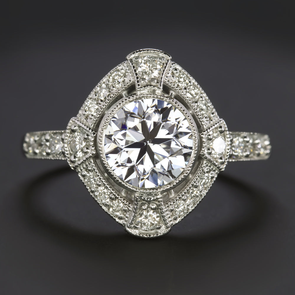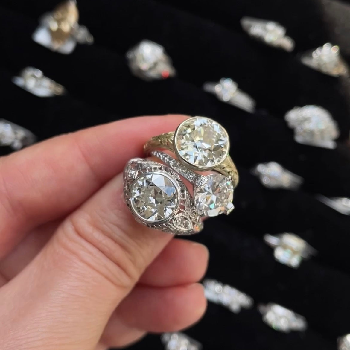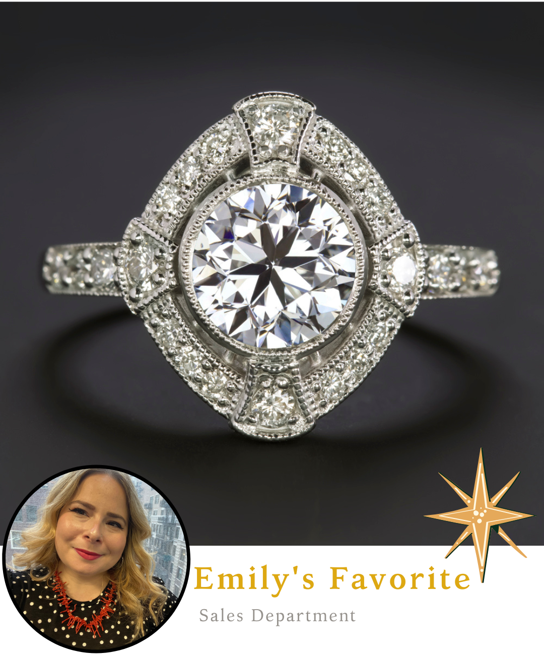Beautiful vintage diamond center stone surrounded by custom cut emeralds scattered with bright white diamonds. Incredible detail and masterfully crafted that would be very hard to say no to! - Brittney