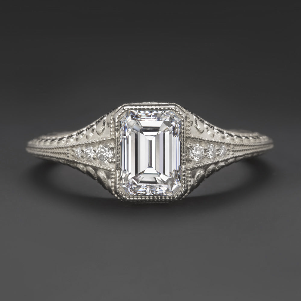 The emerald and platinum details on this ring are superb and the high quality center stone is sure to impress - Amanda