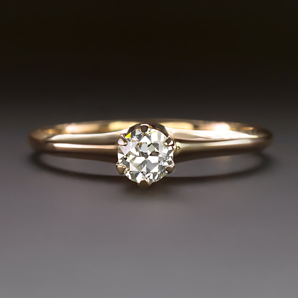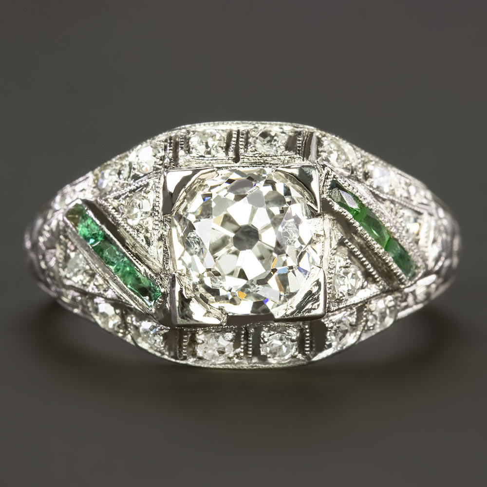 Antique Old Mine Cut Diamond Ring with Emerald Accents