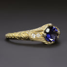 This iolite and diamond cocktail ring features a rich blue iolite set at the center of a chic engraved setting with diamond accent shoulders! The Art Deco style details add a touch of vintage glamour and sophistication!