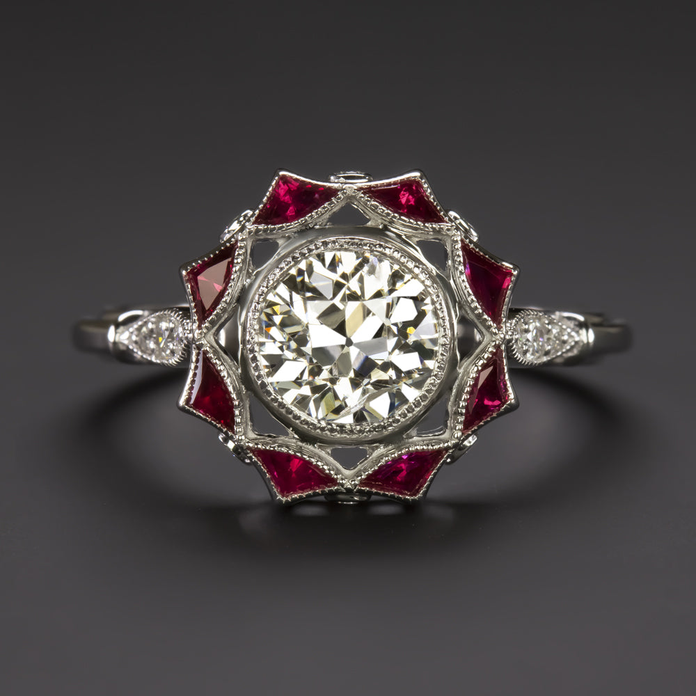 1.05ct G SI2 OLD EUROPEAN CUT DIAMOND COCKTAIL RING VINTAGE STYLE RUBY HALO RED