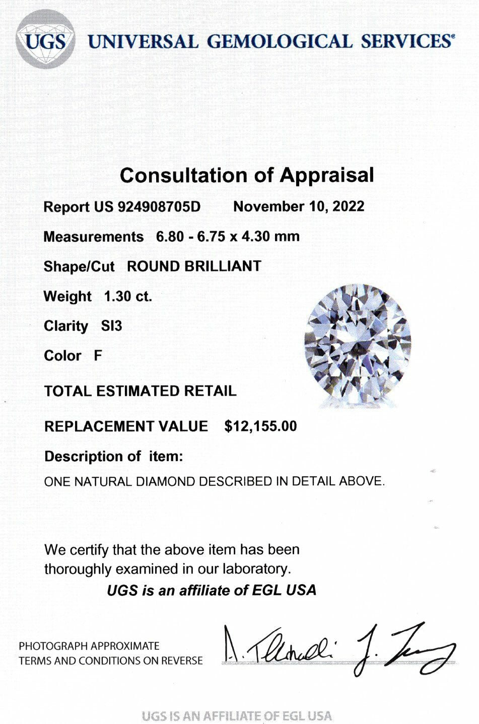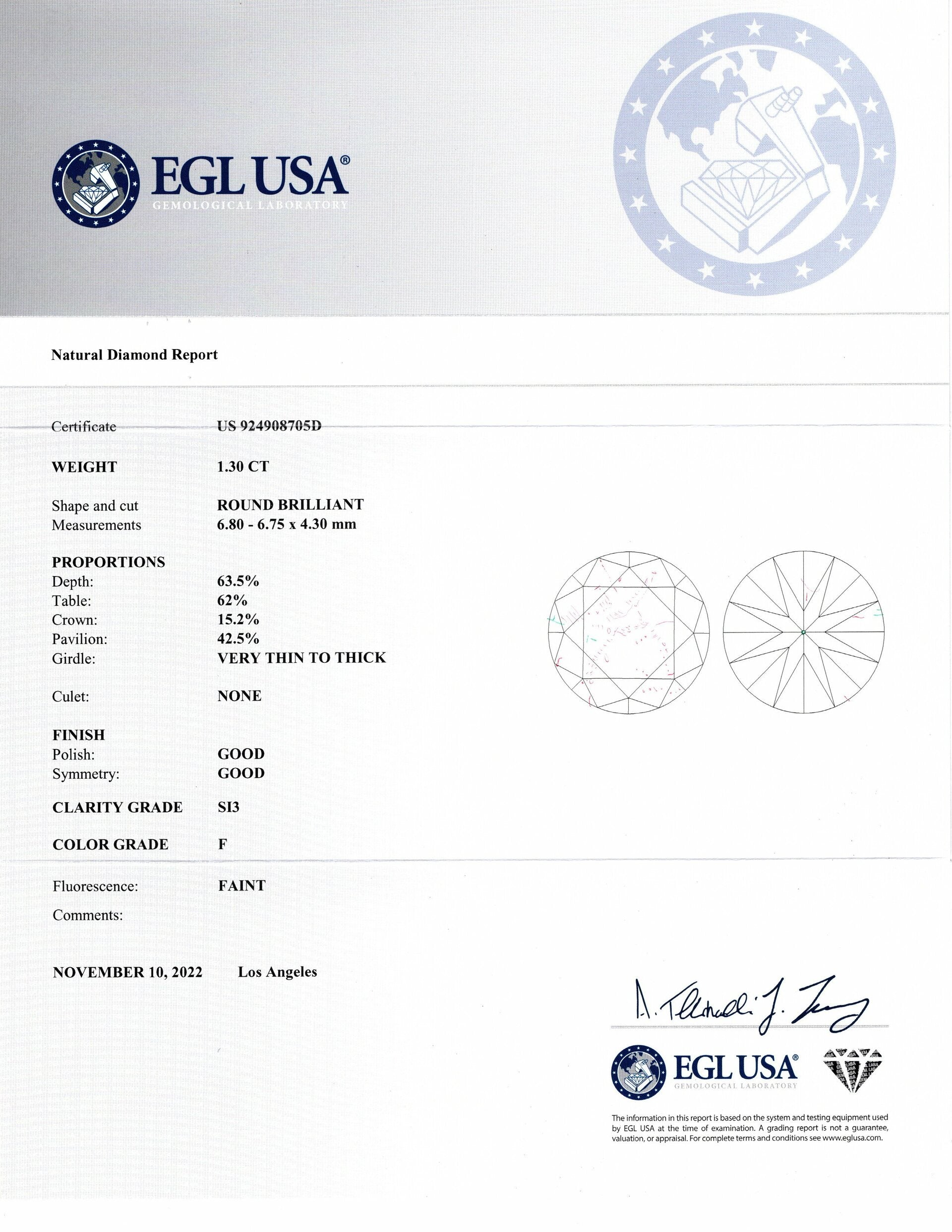 1.30ct CERTIFIED F SI ROUND BRILLIANT CUT DIAMOND LOOSE NATURAL COLORLESS RBC