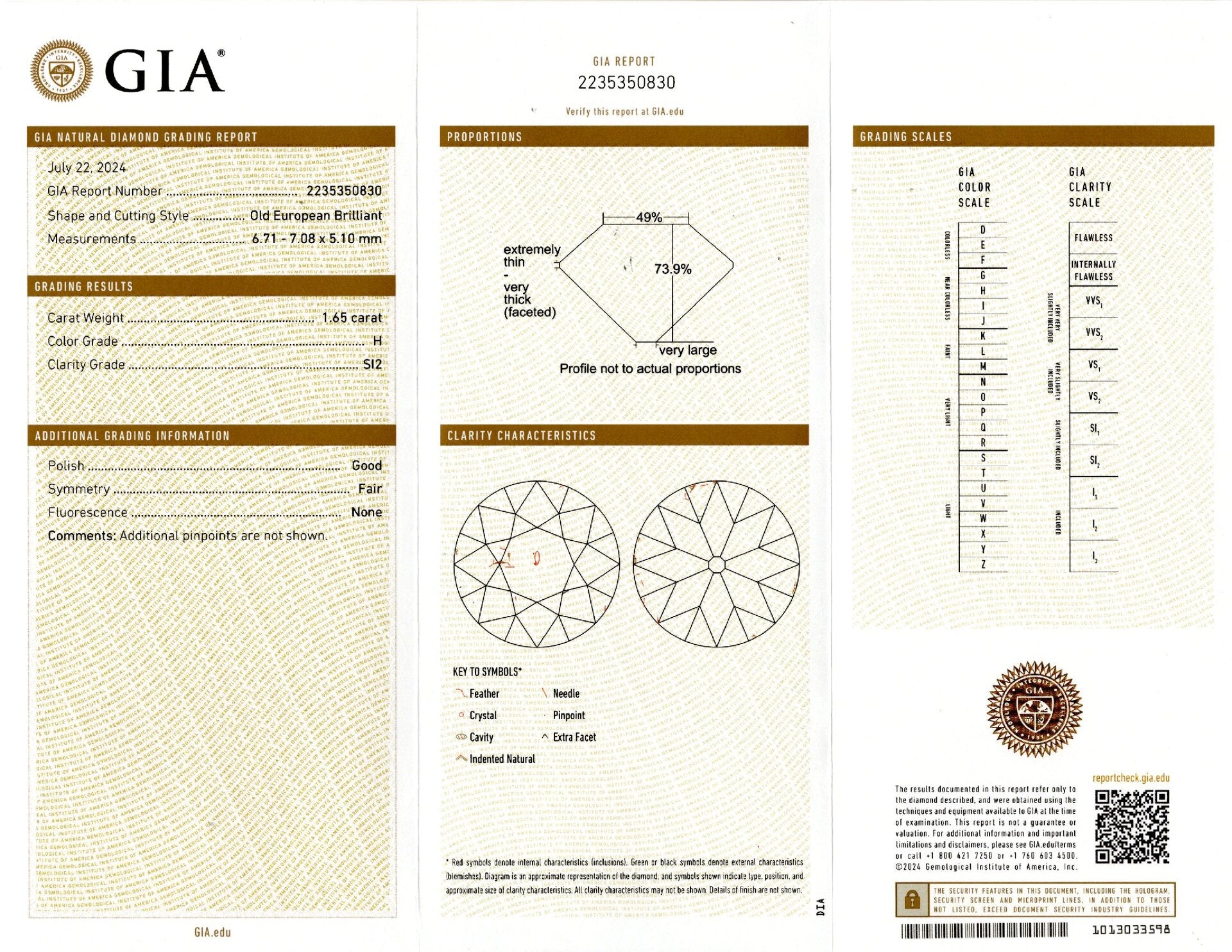 1.65ct OLD EUROPEAN CUT DIAMOND GIA CERTIFIED H SI2 LOOSE NATURAL VINTAGE ESTATE