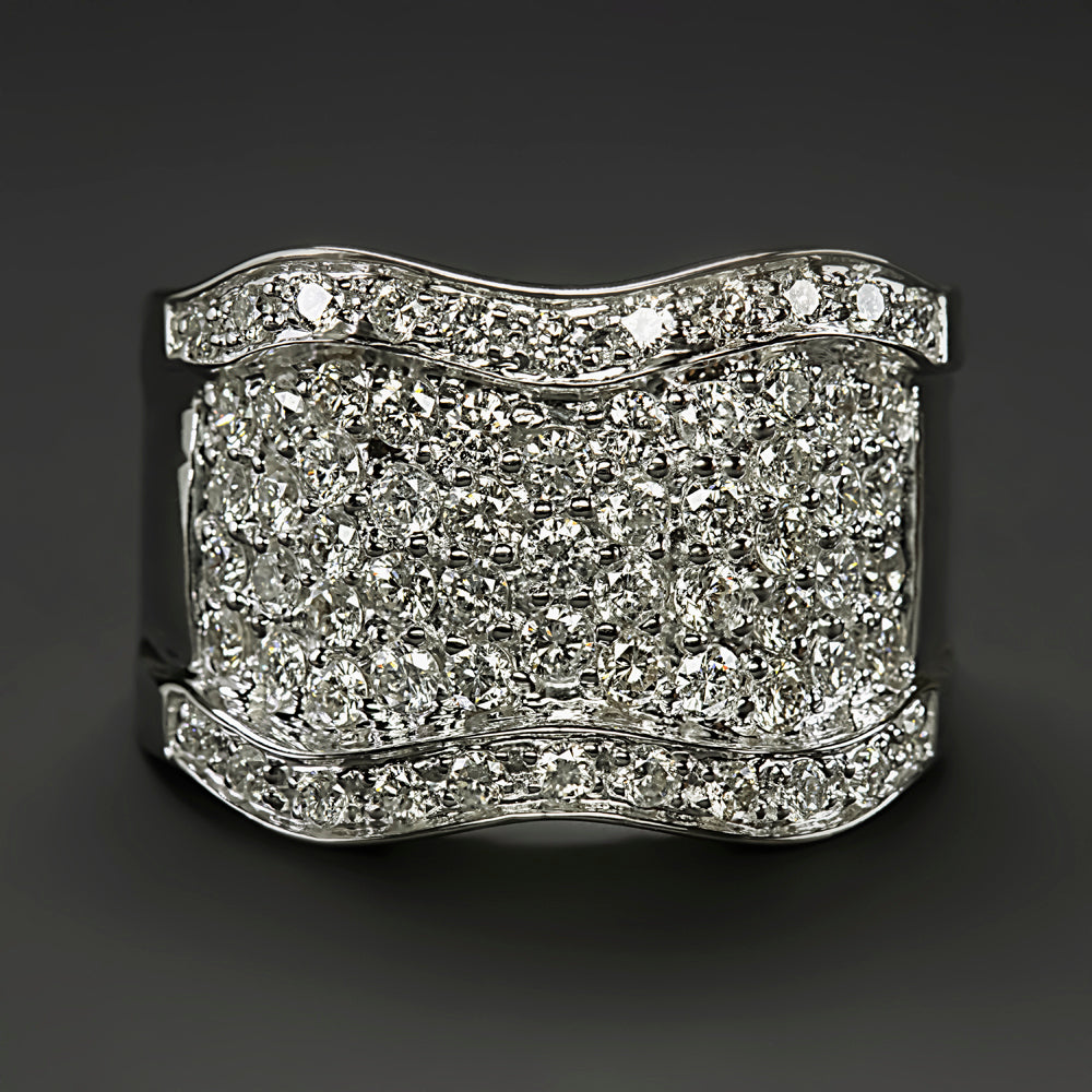 This eye-catching diamond cocktail ring features a wide swath of bright diamonds bounded by a charming wavy border! This is a designer piece, signed by Sonia B.